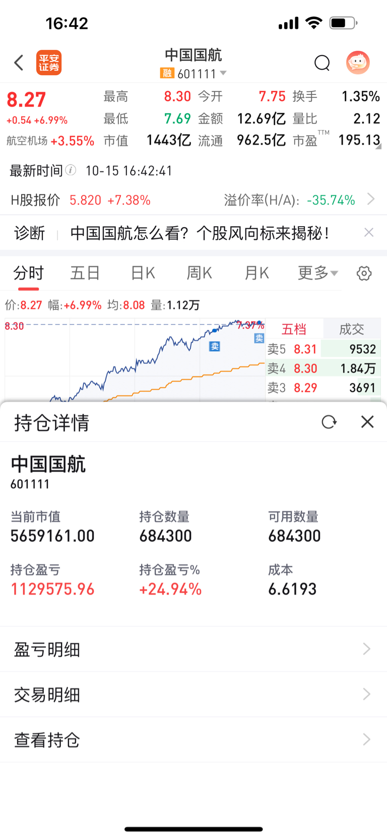 $中国国航(SH601111)$ 小喷子们继续来喷,忍你们2月了,今天卖了一半,虽然说知到它一定上9。调仓了