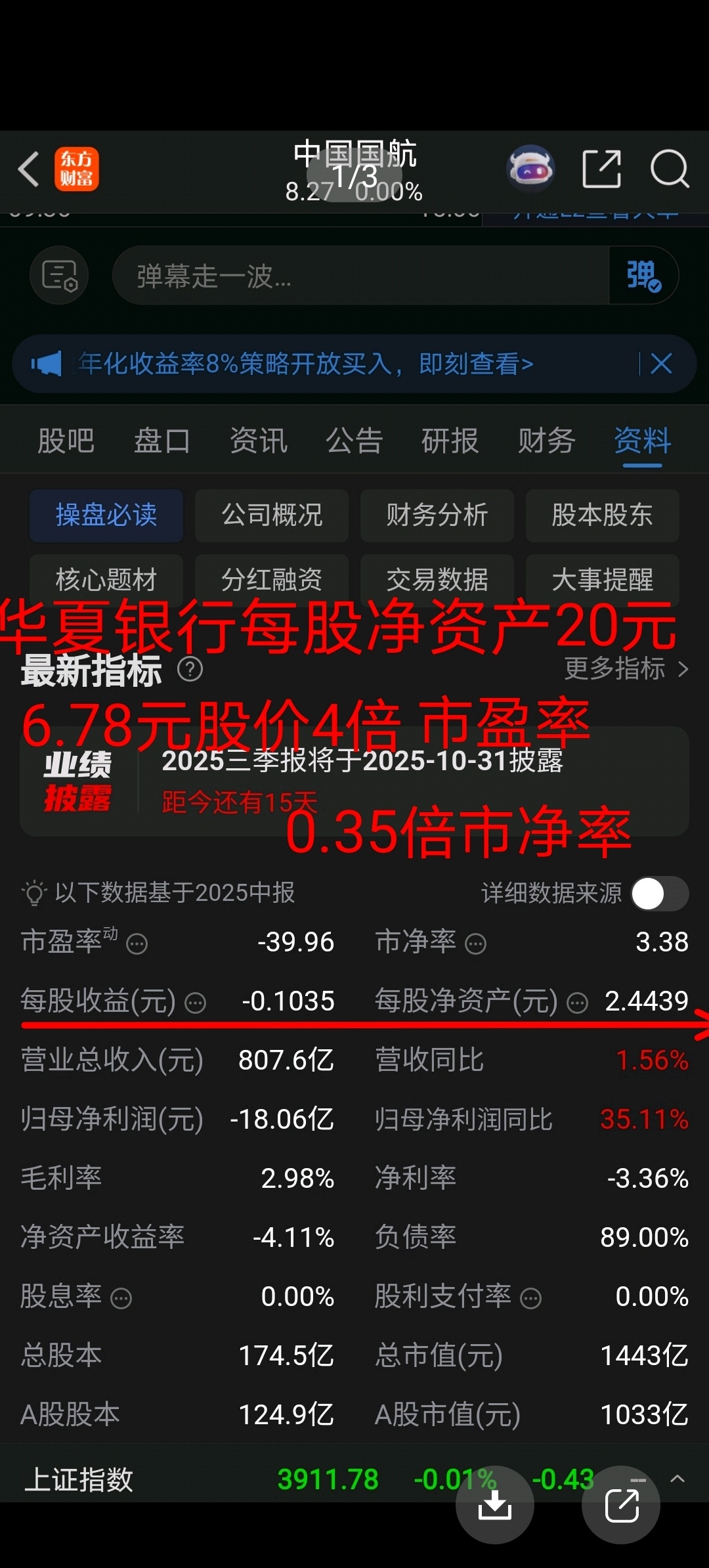 $中国国航(SH601111)$ $华夏银行(SH600015)$ 中国才是全世界最大发展中国家,银行股票平均市净率不应低于印度2.5倍,所以华夏银行必见到(每股20元净资产x2.5倍市净率二50元股价)