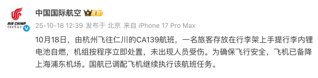 突发!行李架起火,紧急备降上海!官方通报:锂电池自燃!