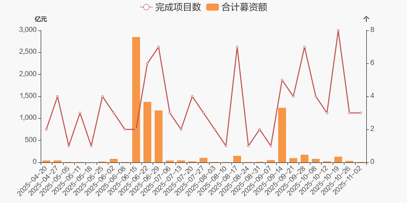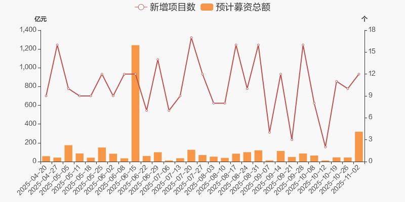 本周(2025/10/26-2025/11/02)共新增12例定增预案,预计募集资金共计318.6亿元,新增项目数量环比增加2例,预计募资总额环比增长274.77亿。