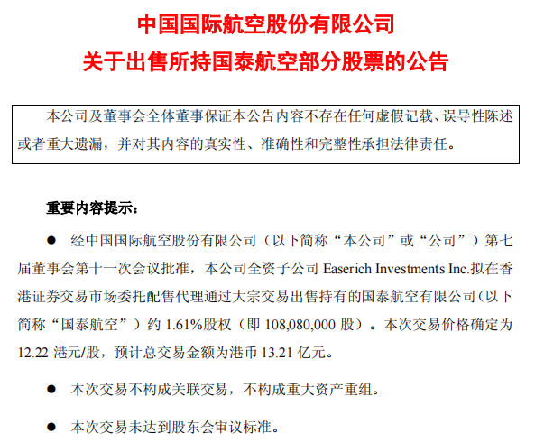 1月6日,中国国际航空股份有限公司(下称“国航”)发布公告,宣布旗下全资子公司Easerich Investments Inc.计划通过大宗交易方式,出售所持国泰航空有限公司(下称“国泰航空”)约1.61%股权,共计1.08亿股。