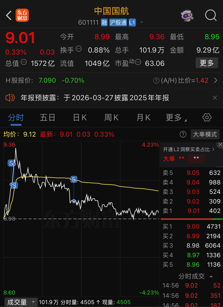 国航今天基本清仓式减持,目前持有今天连续3笔卖出后,国航只持有基本仓位。