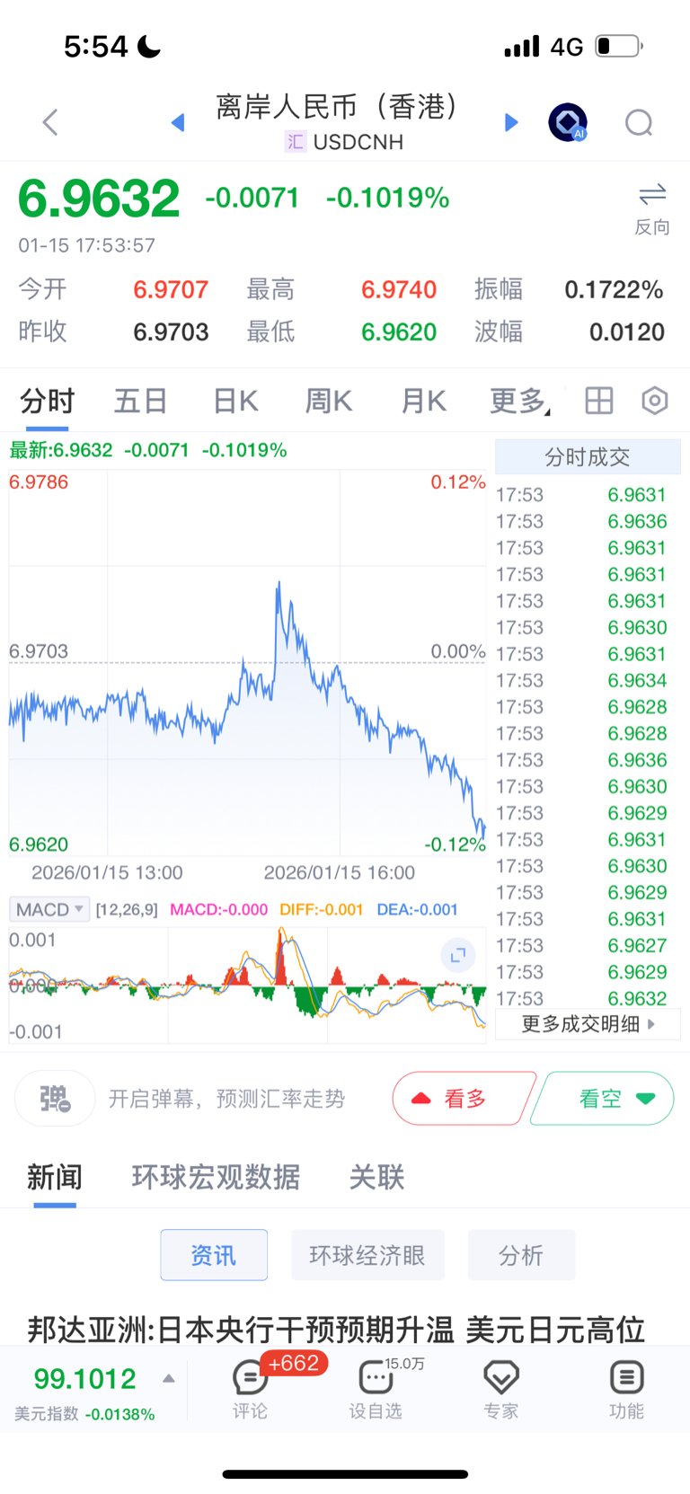 截止2026年1月15日17.55分,国际暴跌4.01%,盘中人民币汇率创近三年