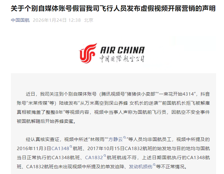 每经AI快讯,1月24日,中国国航微信公众号发布《关于个别自媒体账号假冒国航飞行人员发布虚假视频开展营销的声明》,全文如下: