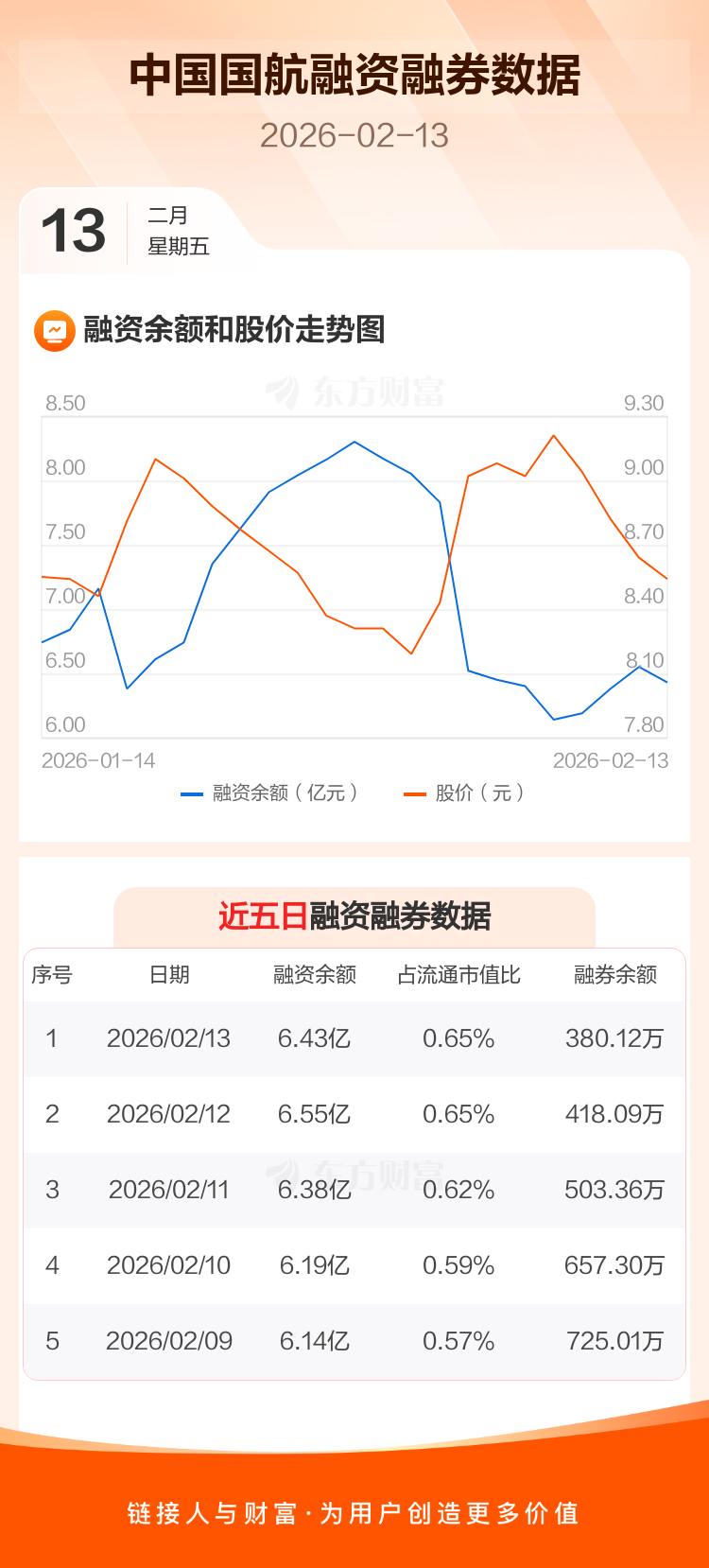 交易所最新数据显示,中国国航于2026年2月13日获融资买入3639.08万元,融资偿还4816.43万元,当日融资净偿还1177.35万元。目前,该股融资余额6.43亿,占流通市值比例为0.65%。
