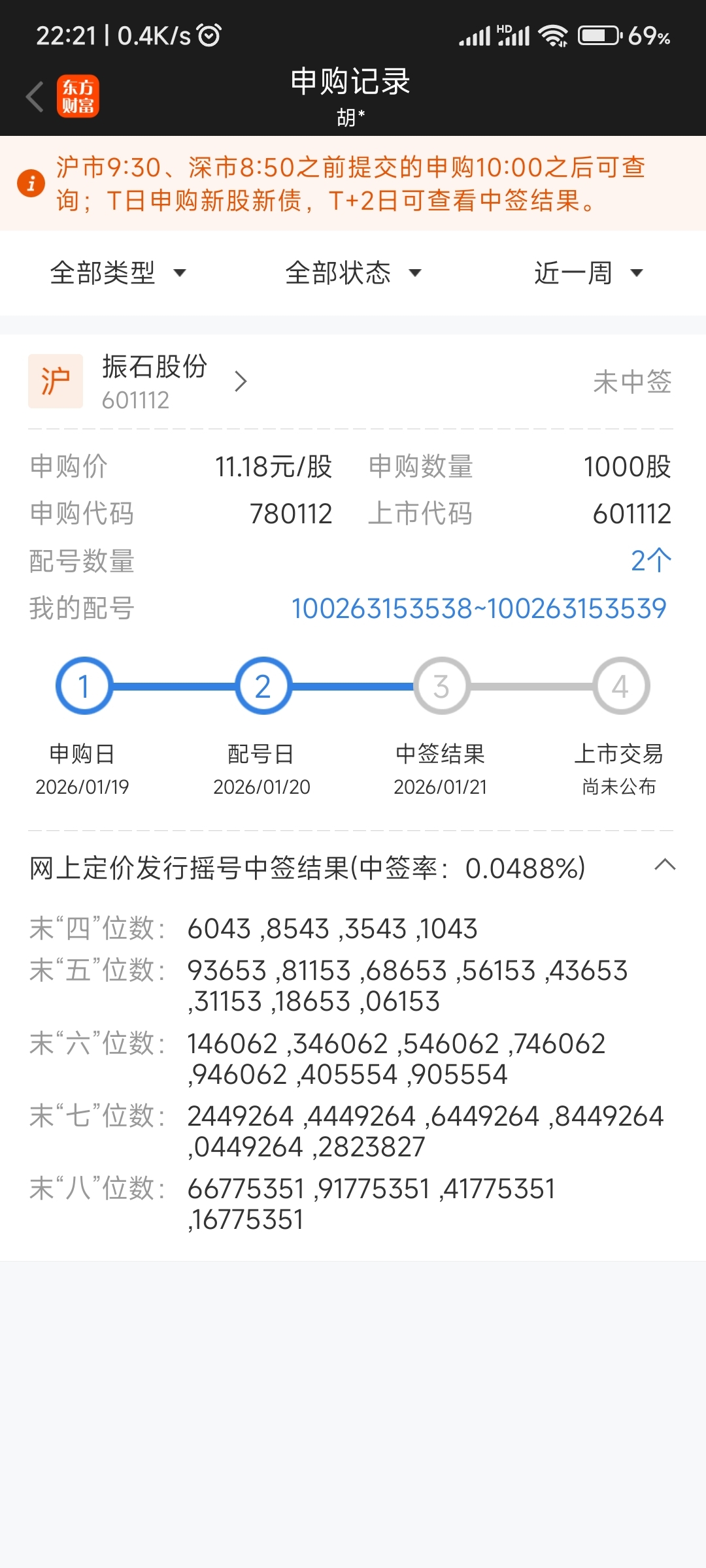 $振石股份(SH601112)$ 腻麻麻的,我柚子帝没那么多钱,亏得只剩1万不到了,就差了这么几位啊,3543,我要是再多点持股资金就能中了。就差了6个号