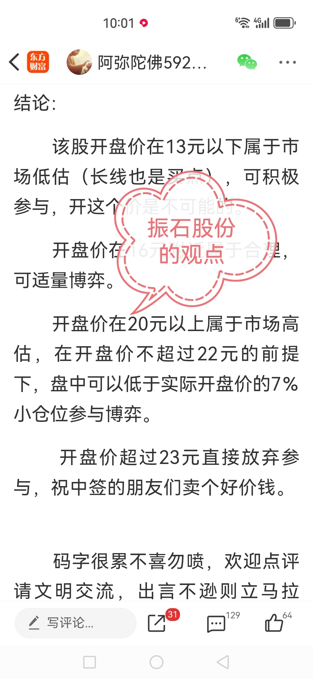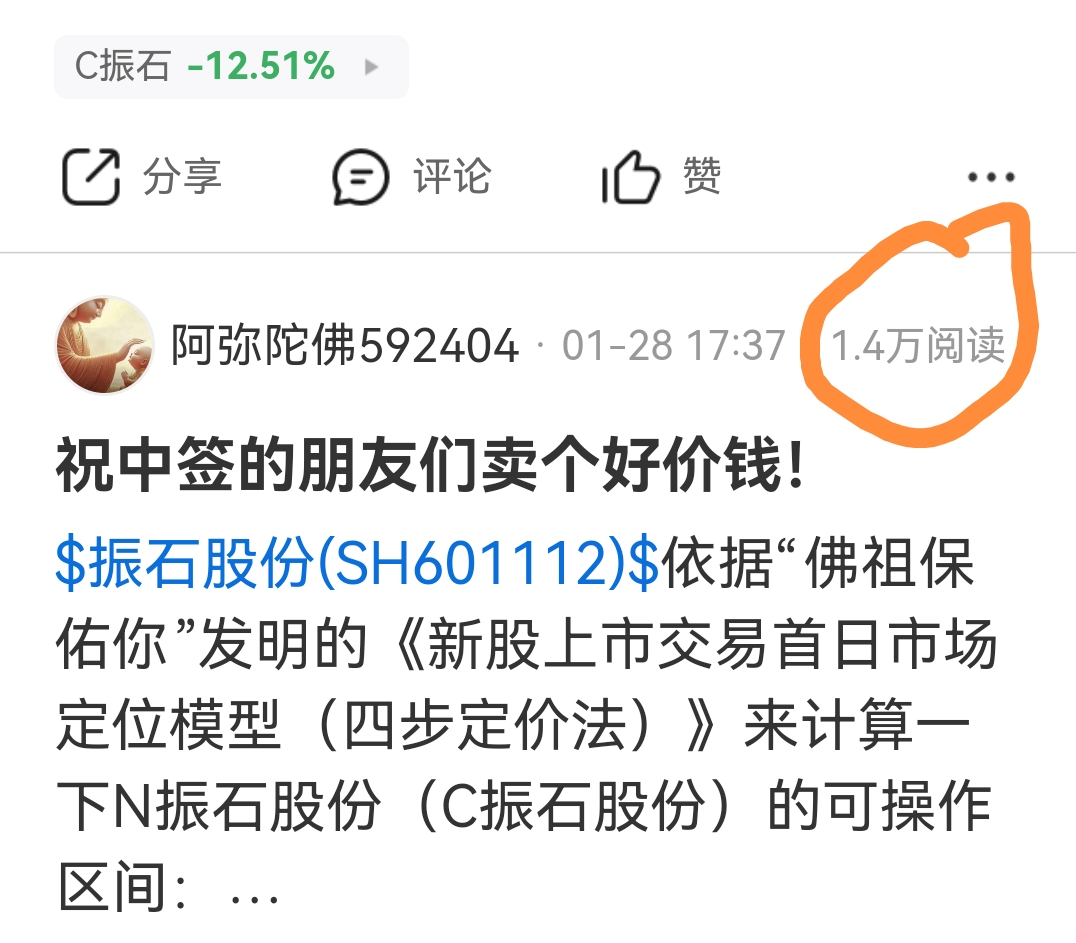 $C振石(SH601112)$ 的确是想参与这个股票的朋友请回答一下:我的文章你看了吗?请顶贴留言。1.4万的阅读量我救了多少想在第一天、第二天买这个新股的朋友们啊!顶贴留言达到100人,星期天晚上我就发下周一具体的操作预案。