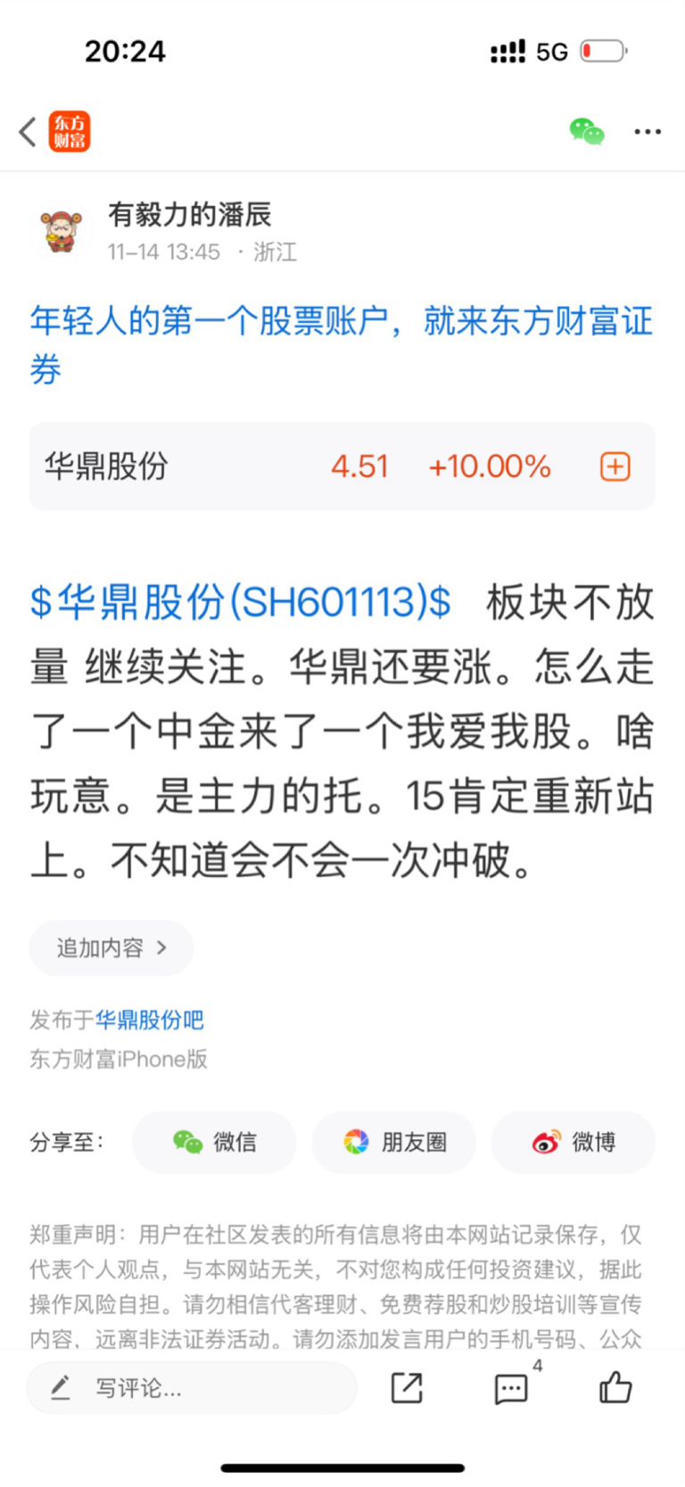 $华鼎股份(SH601113)$ 你要永远相信我 本来股市一天一个样 你预测不了未来 结合量能和涨势 日k 板块能分析出近期走势 这3天化纤板块有点滞涨了 没配合量能上去 板块可能会回调了 华子可能今天有华字预期在 明天看华胜天成 华夏幸福 强不强 强的很还是有预期的 主力明天能把近4年套牢盘给释放就是一个好兆头 要成为妖股必须有上涨的逻辑理由 华字今日3个涨停股