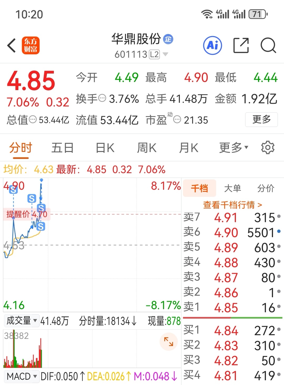 $华鼎股份(SH601113)$ 感恩庄哥,上午爆发的都还是很耿直了,再次感谢,不求涨停了!
