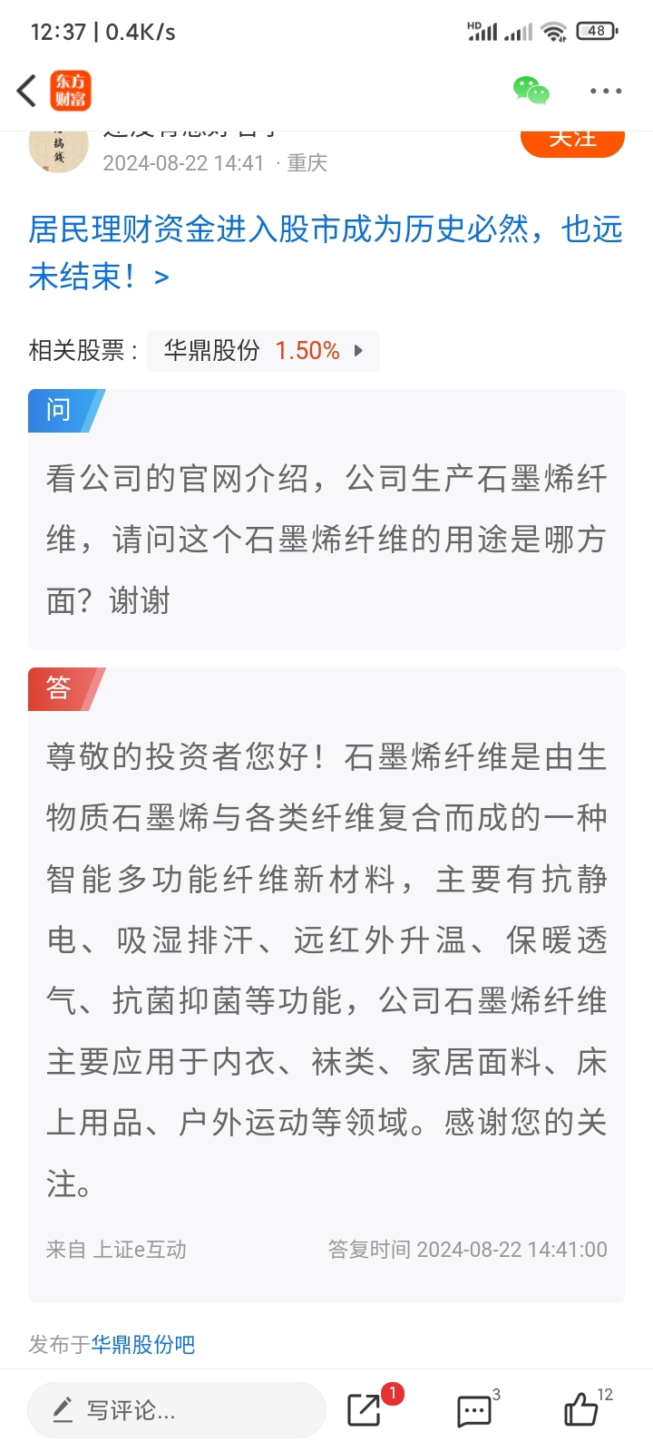 2024年8月22日14时41分,公司通过上证e互动答复投资者:公司石墨烯纤维主