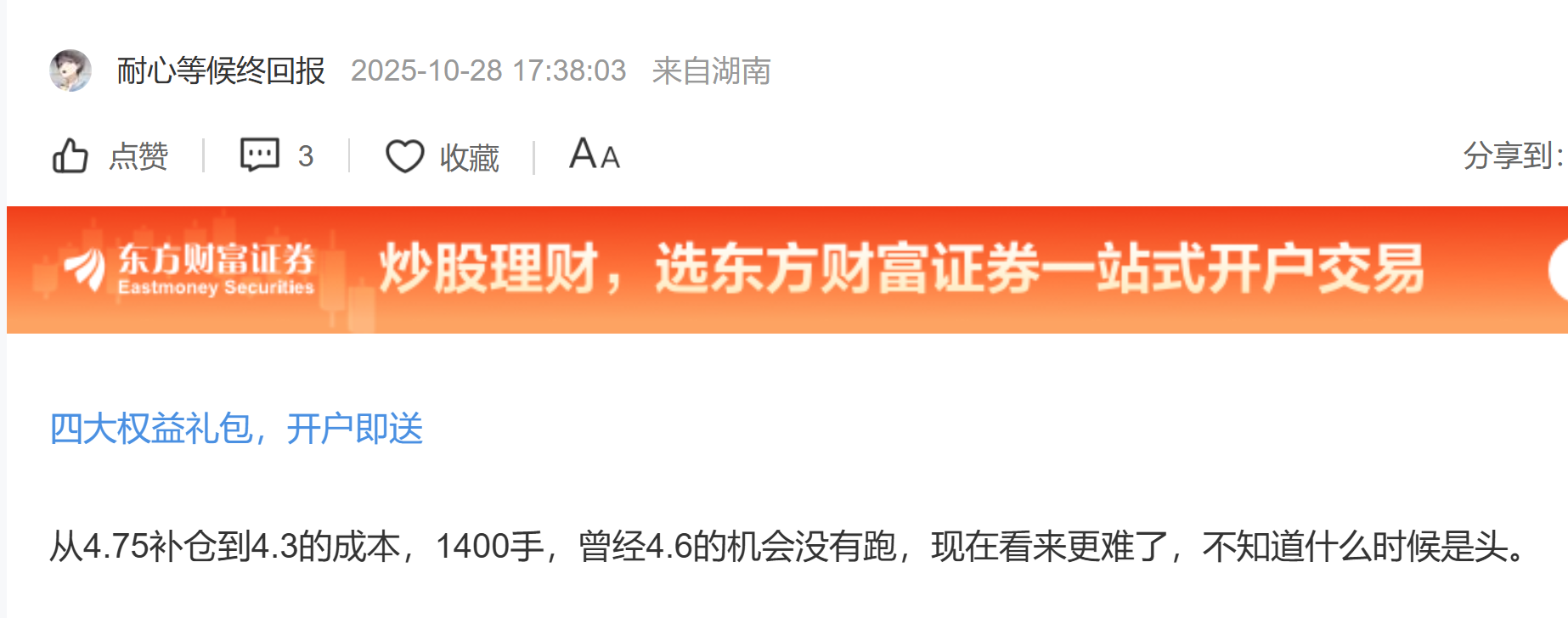温馨提示: 1.根据《证券法》规定,禁止编造、传播虚假信息或者误导性信息,扰乱证券市场;2.用户在本社区发表的所有资料、言论等仅代表个人观点,与本网站立场无关,不对您构成任何投资建议。用户应基于自己的独立判断,自行决定证券投资并承担相应风险。《东方财富社区管理规定》