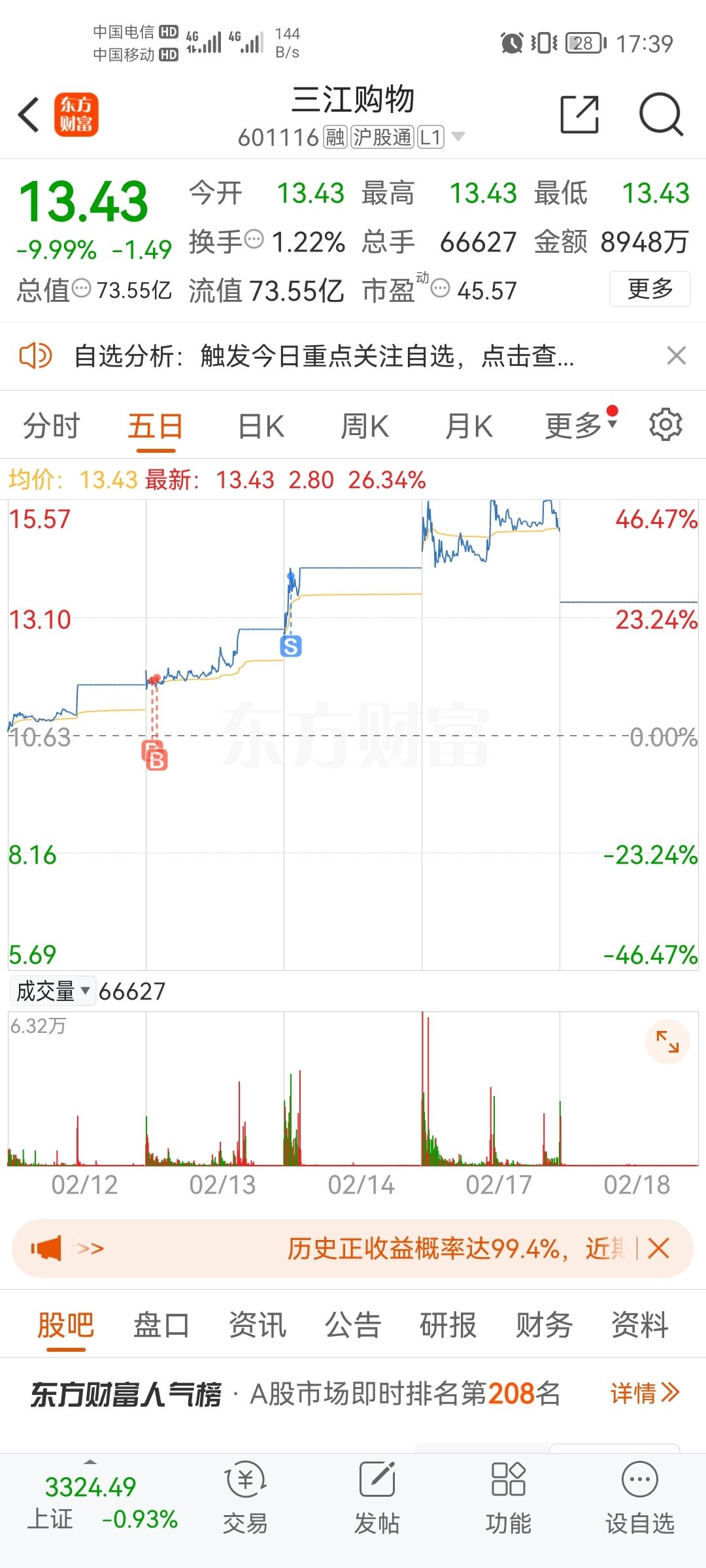 $三江购物(SH601116)$ 还说今天进,算了算了
