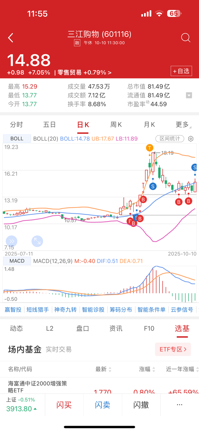 $三江购物(SH601116)$ 今天涨停板全出,改天见