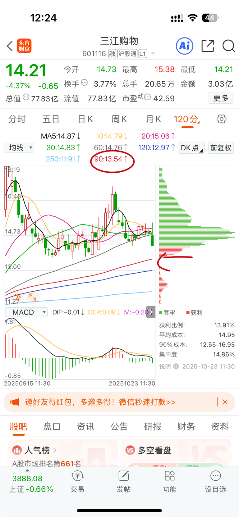 前平台低点13.53,这里的120分钟90均线支撑13.54,会跌到这个位置吗?