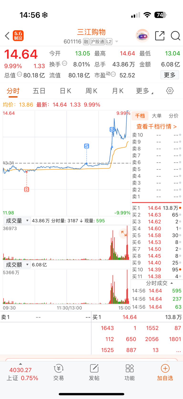 $三江购物(SH601116)$ 成本13.8莫名其妙的让我做到了15.4