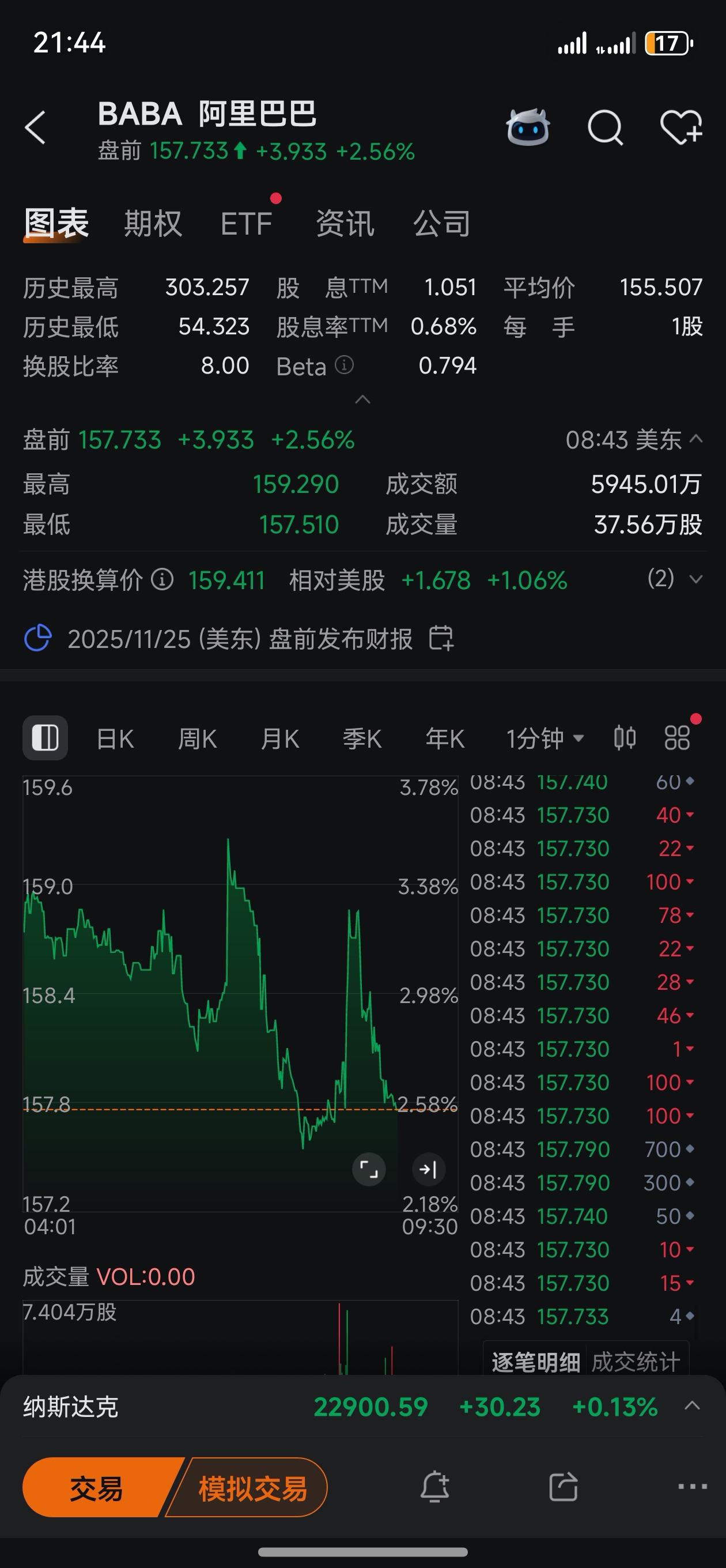 $三江购物(SH601116)$ 美股盘前 阿里巴巴大涨