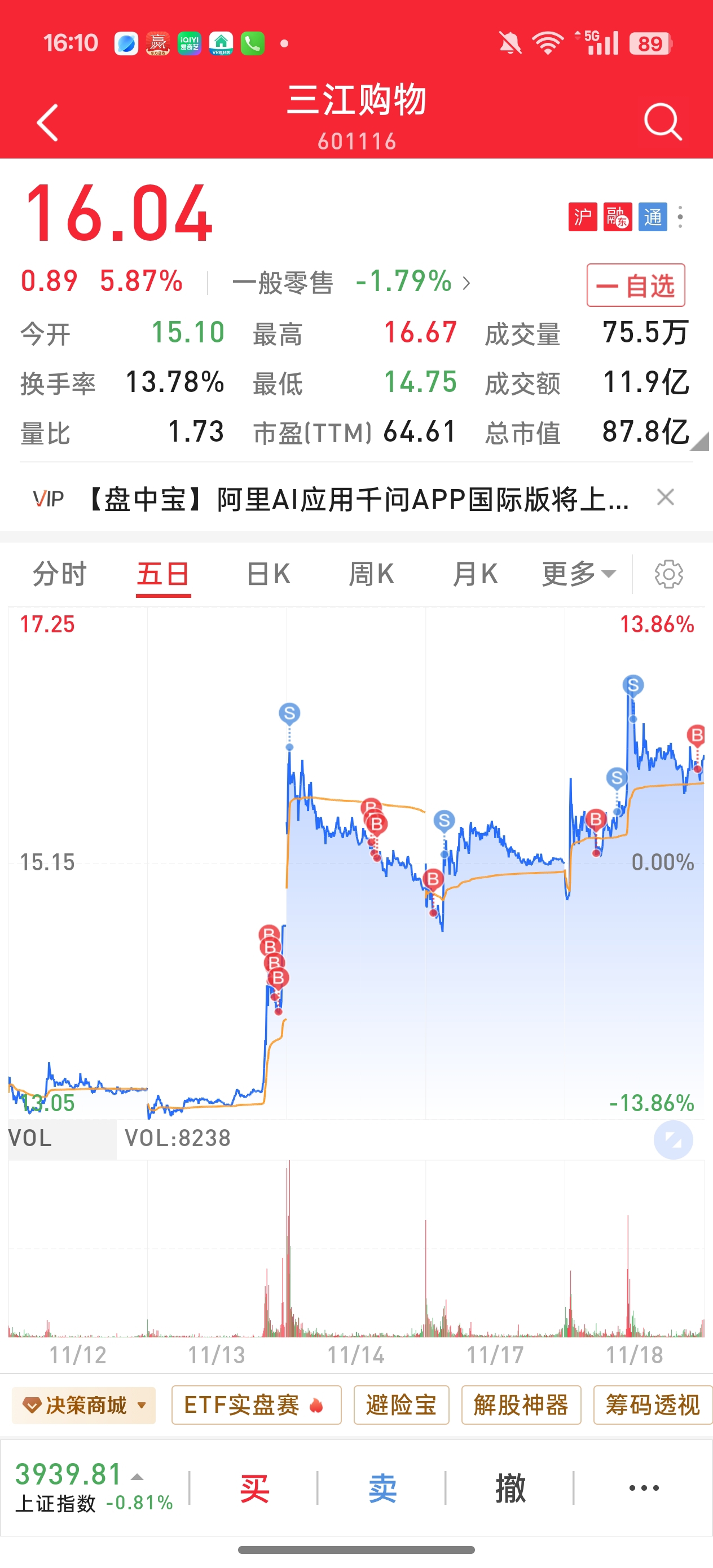 $三江购物(SH601116)$ 跟着主力做T,哈哈