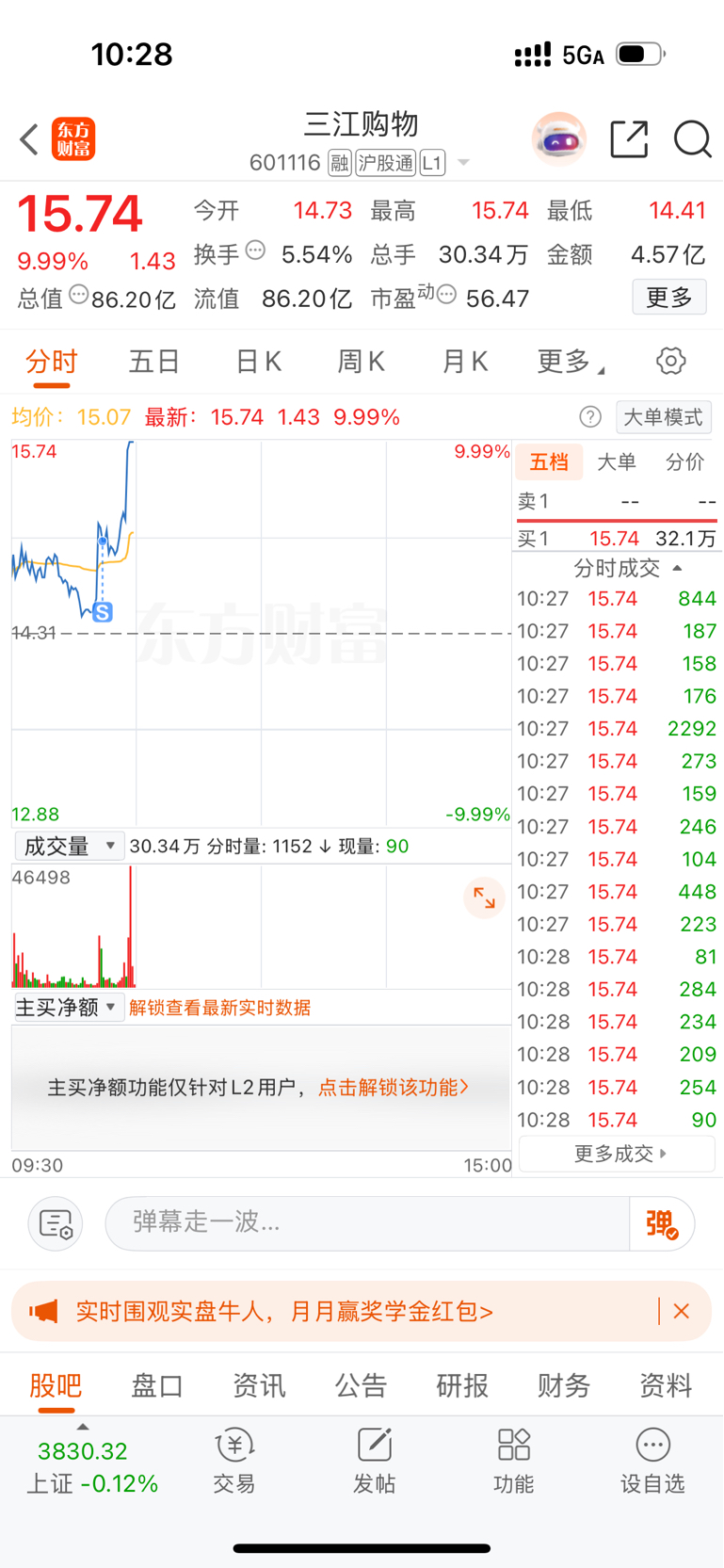 $三江购物(SH601116)$ 上一个涨停 跟的也是它。今天切换过去了