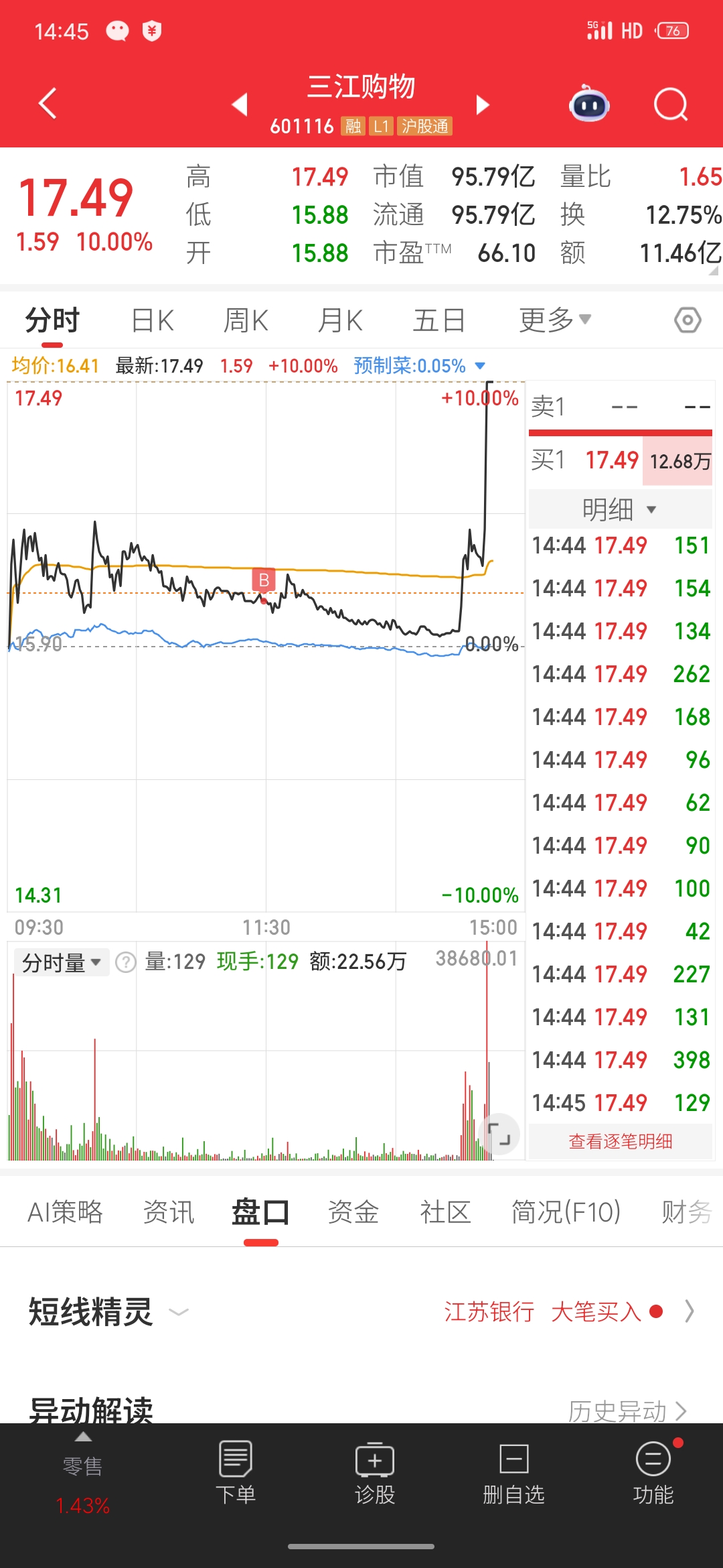 $三江购物(SH601116)$ 气死,尾盘以为是诱多,卖了1/3仓
