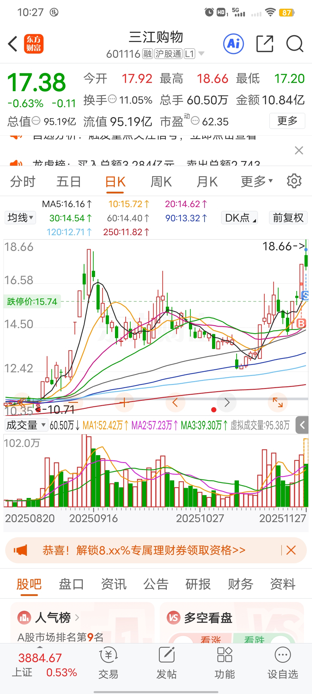 消费一日游,套利为主!不过三江目前也算是解放了前期套牢盘新高了,那么后市可期,今天先止盈出来,后面企稳再考虑!