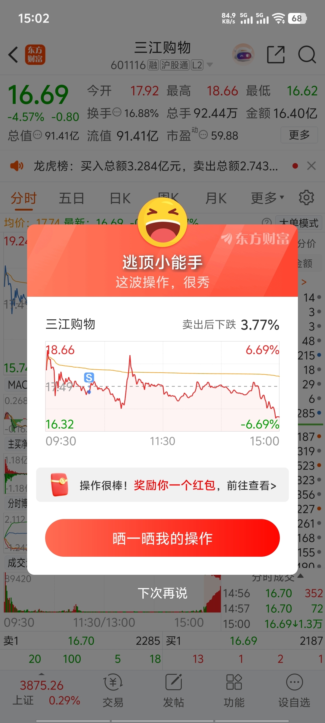 $三江购物(SH601116)$ 今天水下止盈的,不过没亏就好,这市场真的不能格局
