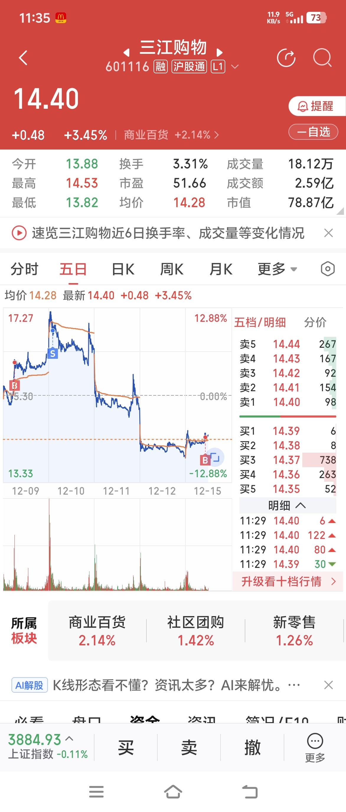 $三江购物(SH601116)$ 兄弟们我又来啦,前面2次每次都是9个点,这次怎么说