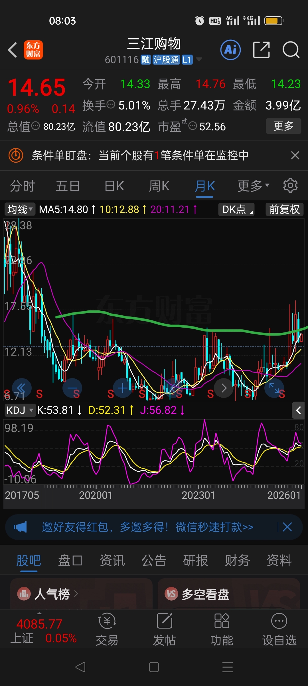 人气升上来了,大盘都15连阳了,三江还是这样,不上16元以上,都还是太弱,买错股