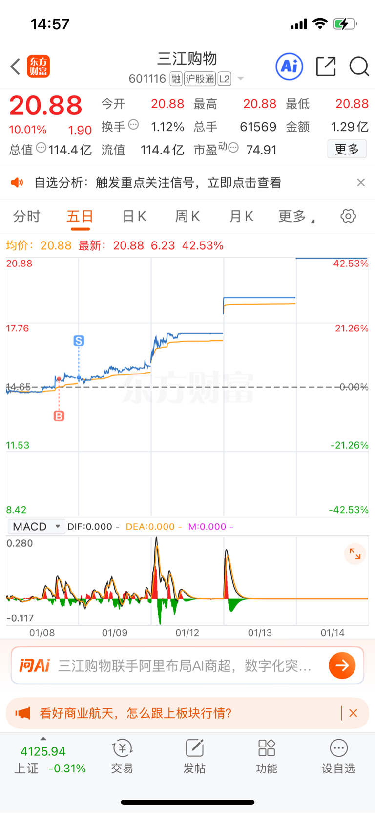 $三江购物(SH601116)$ 满仓倒在黎明前