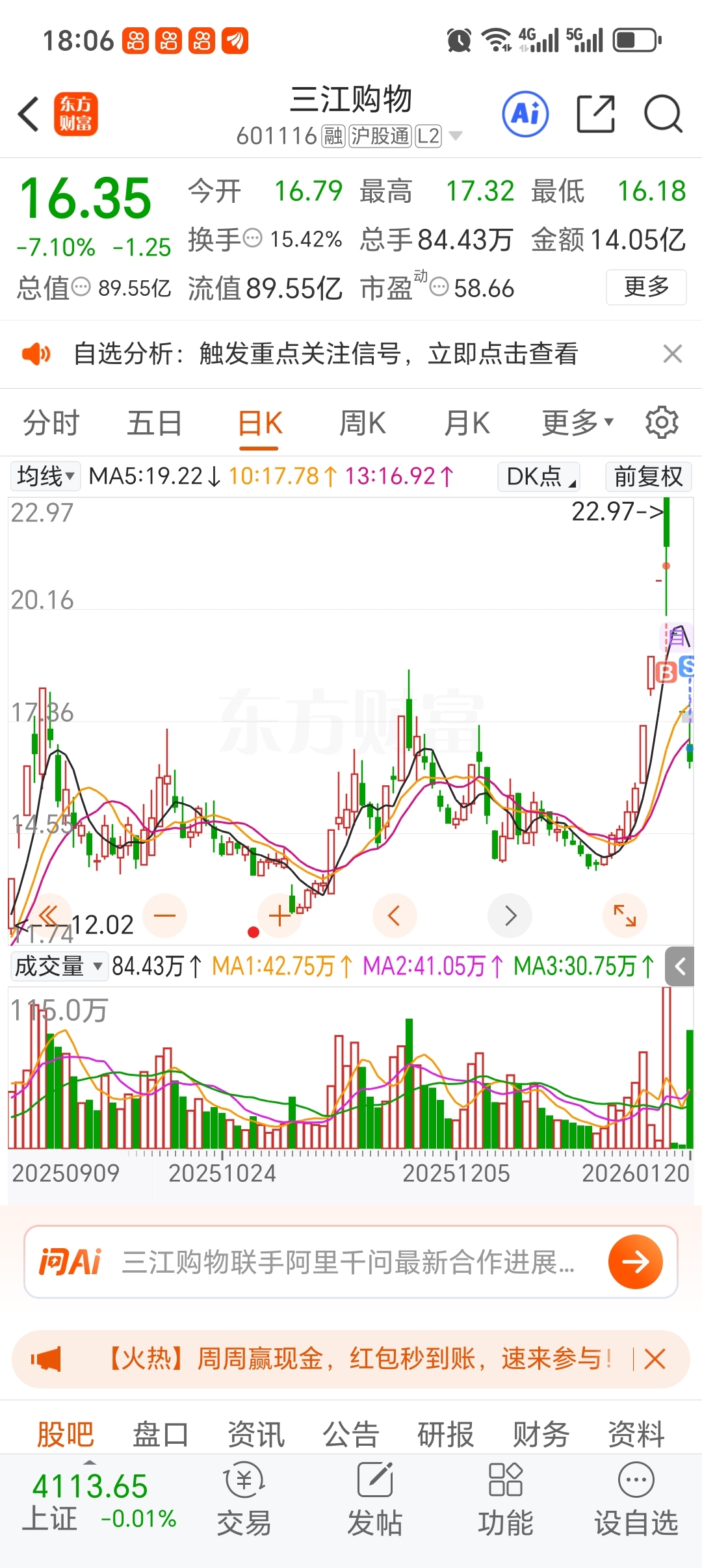 $三江购物(SH601116)$ 靠,从来就没有吃过这么大的亏,你跌我终于出来了,一身轻松,买的时候没注意看这是减持股,减持的股票坚决不能买。
