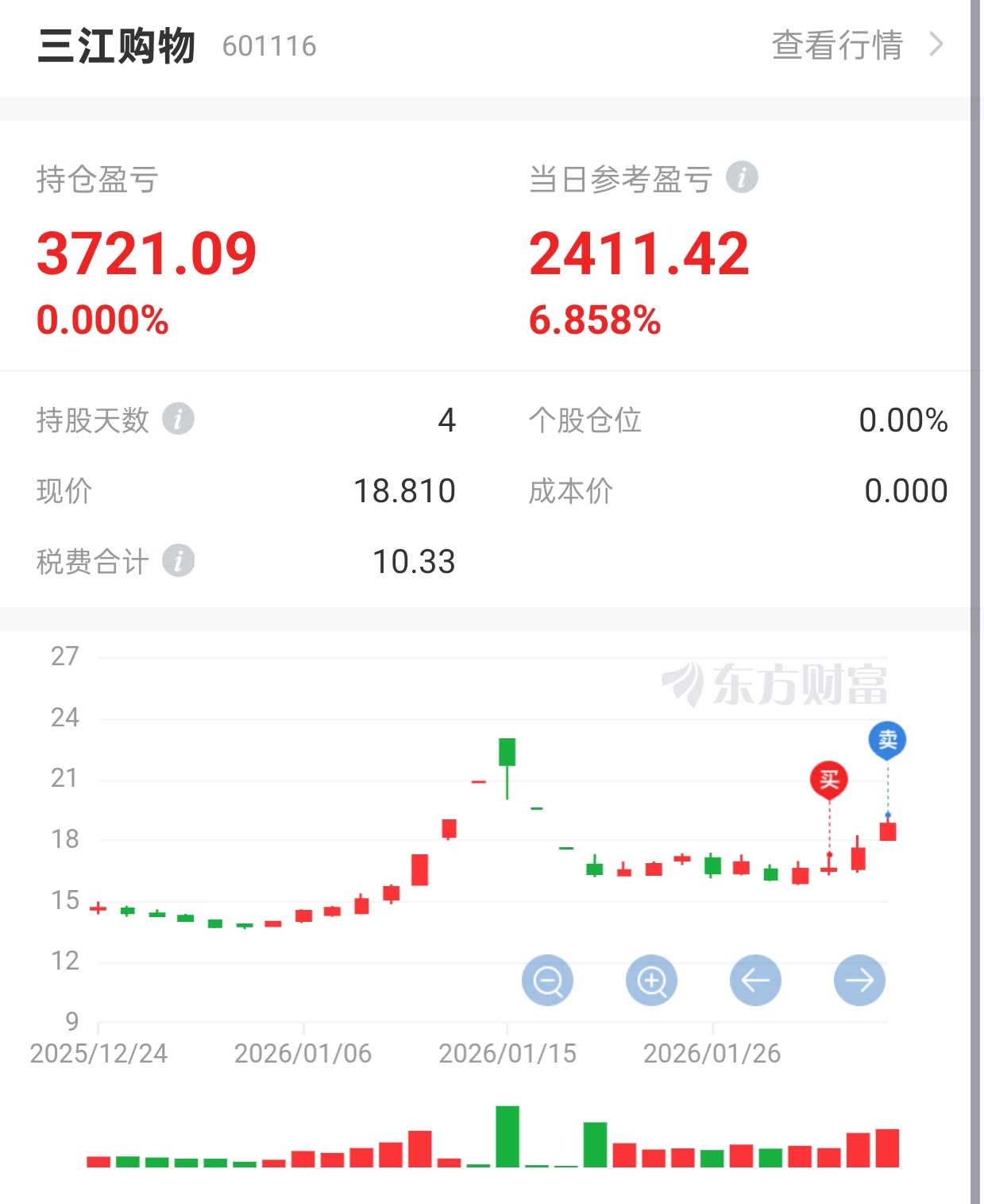 $三江购物(SH601116)$ 1月30日买入的,吃了差不多12个点出了,明天可能还会涨但我选择落袋为安,祝各位发财