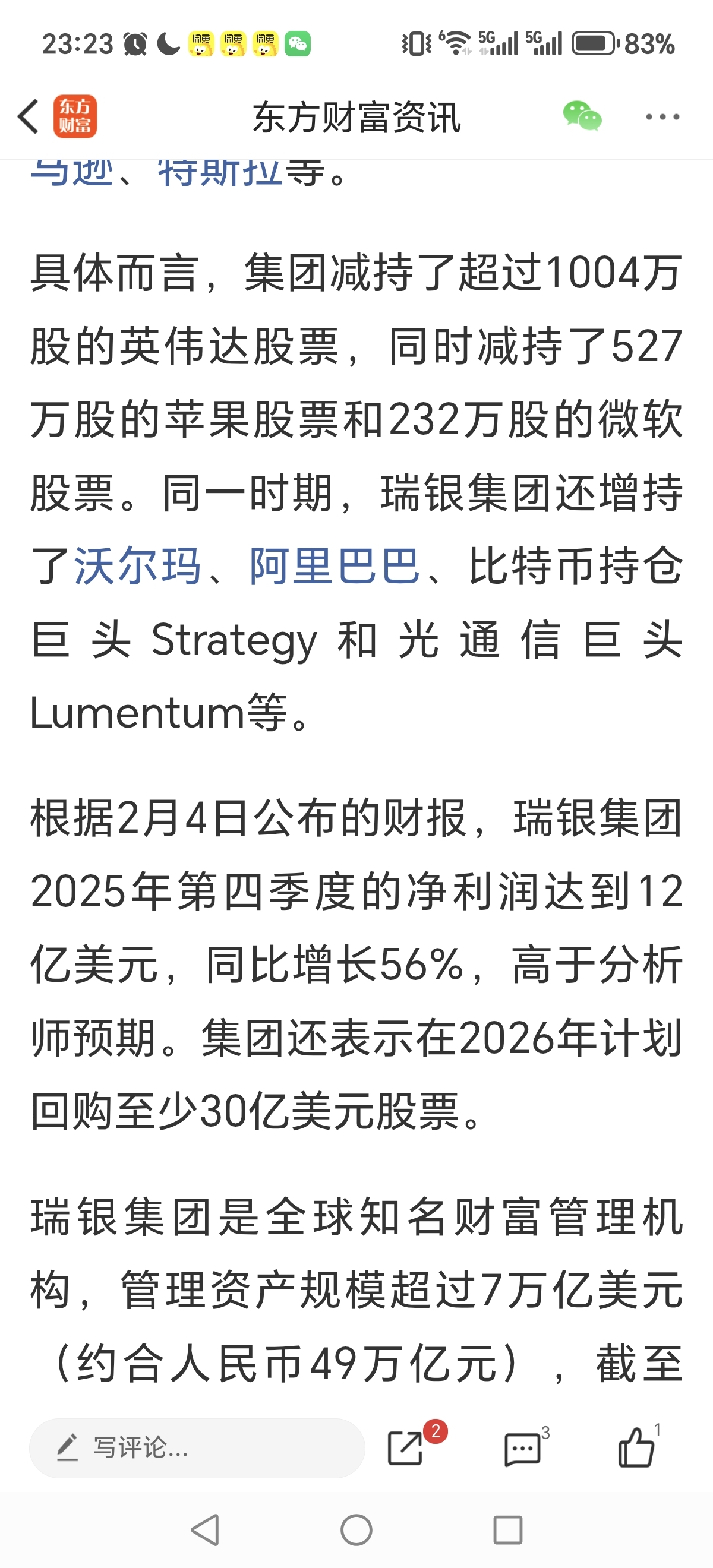 $三江购物(SH601116)$ 瑞银集团大幅增持阿里巴巴,大幅减持英伟达等