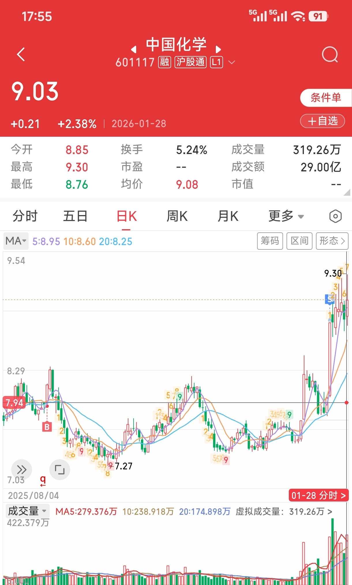 几天的调整,没有达到我的目标,强势调整在8.64,稍弱在8.44,继续观望中。
