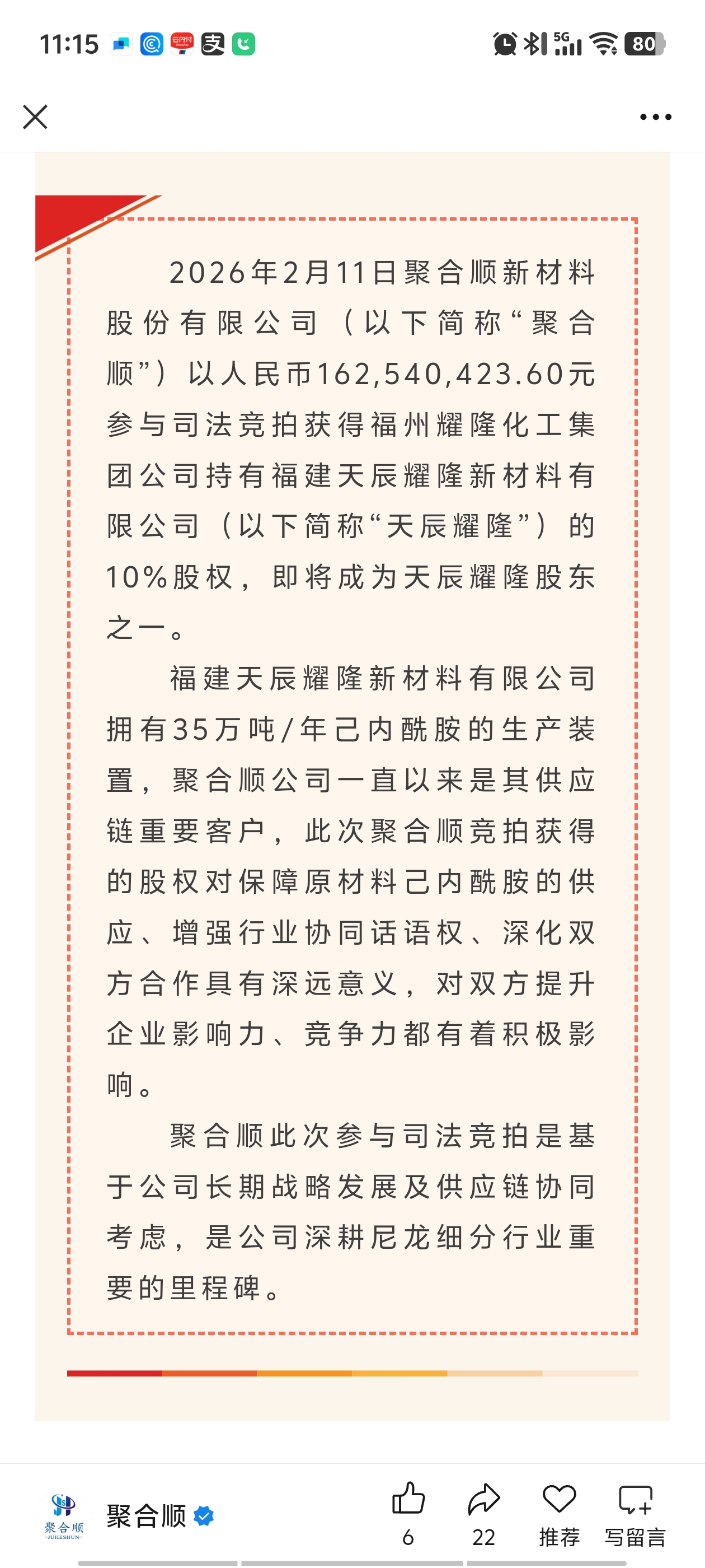 $中国化学(SH601117)$ 问一下各位天辰耀隆和中国化学有什么关系?他的股份被聚合顺竞拍了是什么意思?强强联合?打通上下游?