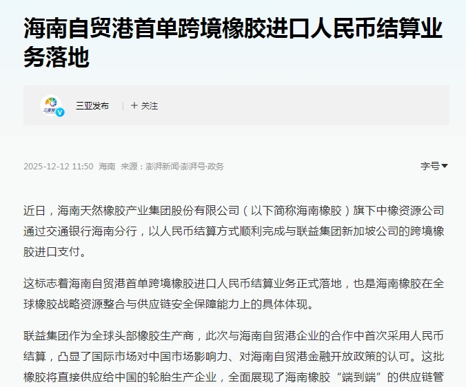 $海南橡胶(SH601118)$ 海南自贸港首单跨境橡胶进口人民币结算业务落地