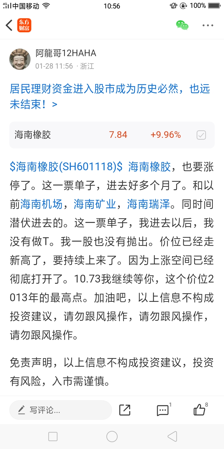 $海南橡胶(SH601118)$ 海南橡胶,今天二连板涨停了。真的不能来念叨你呀,一来念叨你就涨停,嘴巴开过光了。哈哈哈哈哈哈哈哈。但是离我目标还有好远。继续潜伏。加油加油加油!以上信息不构成投资建议,请勿跟风操作,请勿跟风操作,请勿跟风操作。