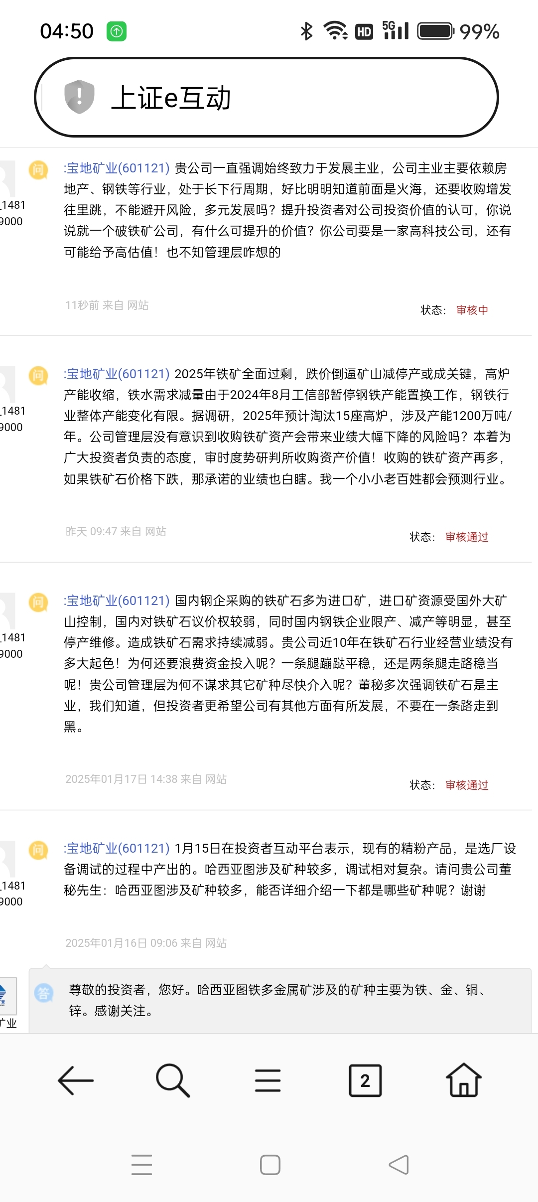 $宝地矿业(SH601121)$ 贵公司董秘大人回复投资者提问时说:提升投资者对公司投资价值的认可,不是靠嘴说的,请问就一个铁矿公司,已经收购了数个铁矿,近10年了,你的价值提现了吗?还是市场说了算!市场里的投资者包括机构和个人投资者都不认可公司当下的行为。用自有资金收购铁矿资产不好吗?用增发收购其他矿产资源不好吗?你们把投资者的诉求当儿戏,用冠冕堂皇的理由搪塞愚弄投资者!