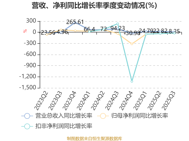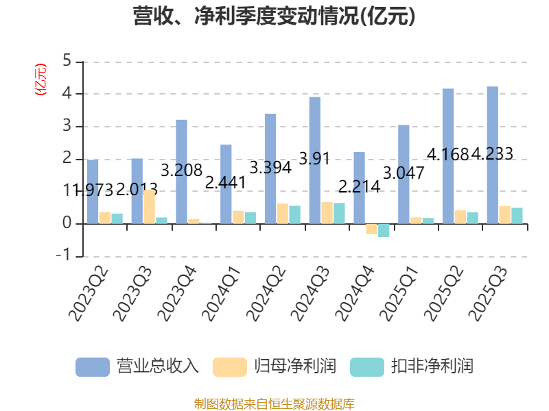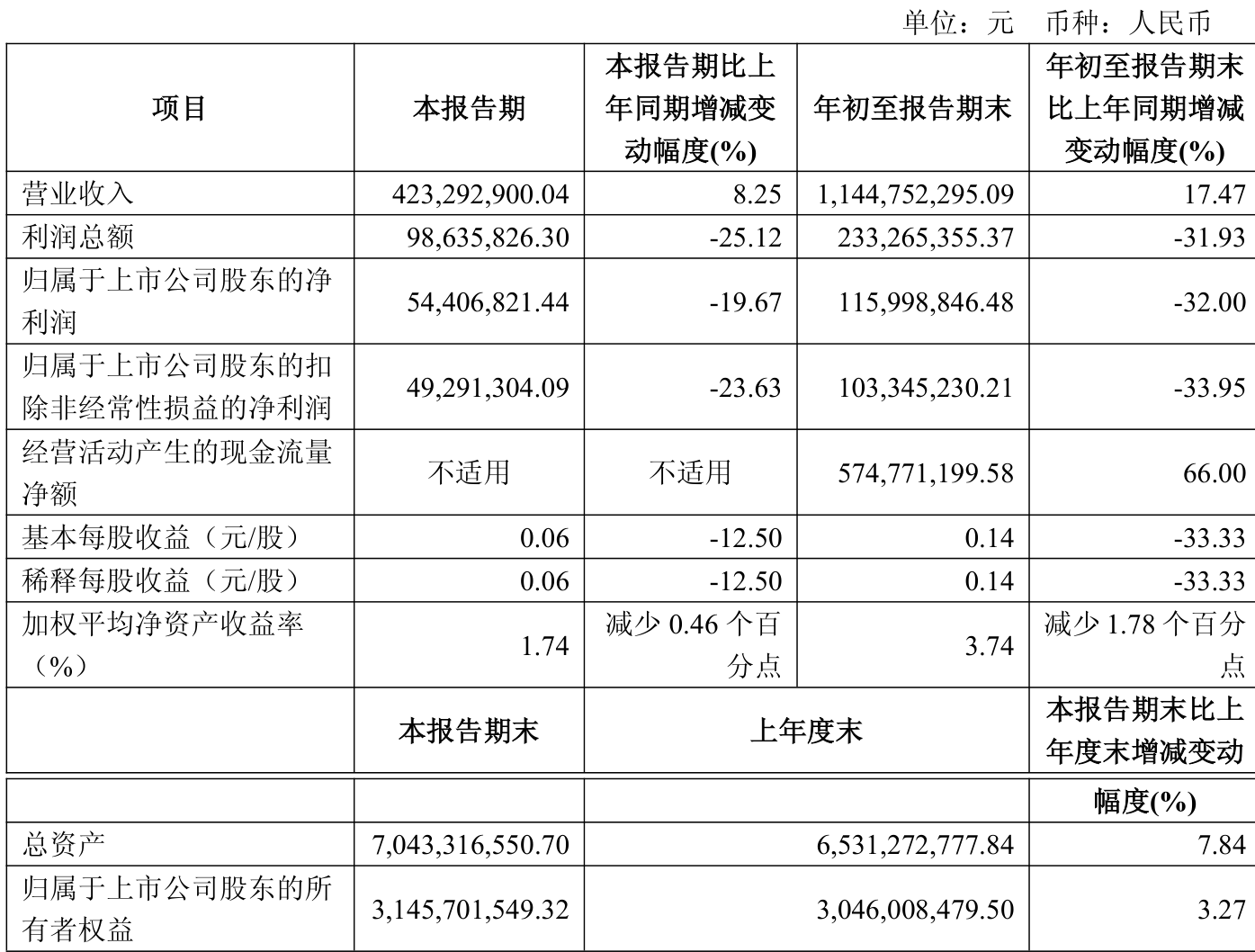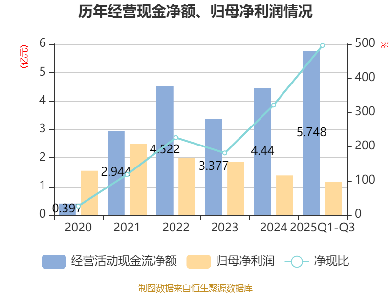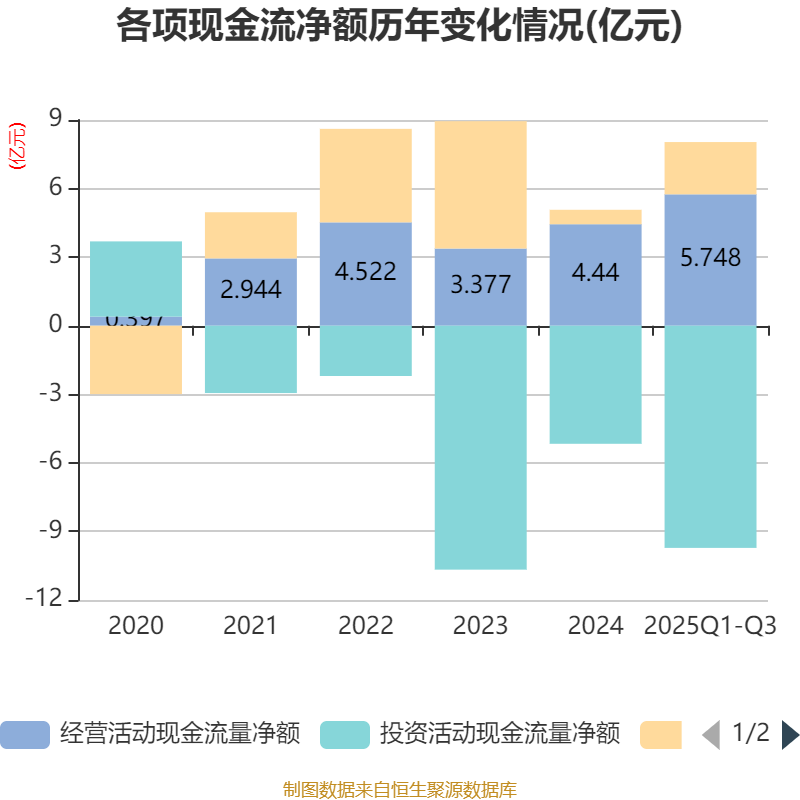 2025年前三季度,公司经营活动现金流净额为5.75亿元,同比增长66%;筹资活动现金流净额2.29亿元,同比增加4.17亿元;投资活动现金流净额-9.72亿元,上年同期为-4.12亿元。