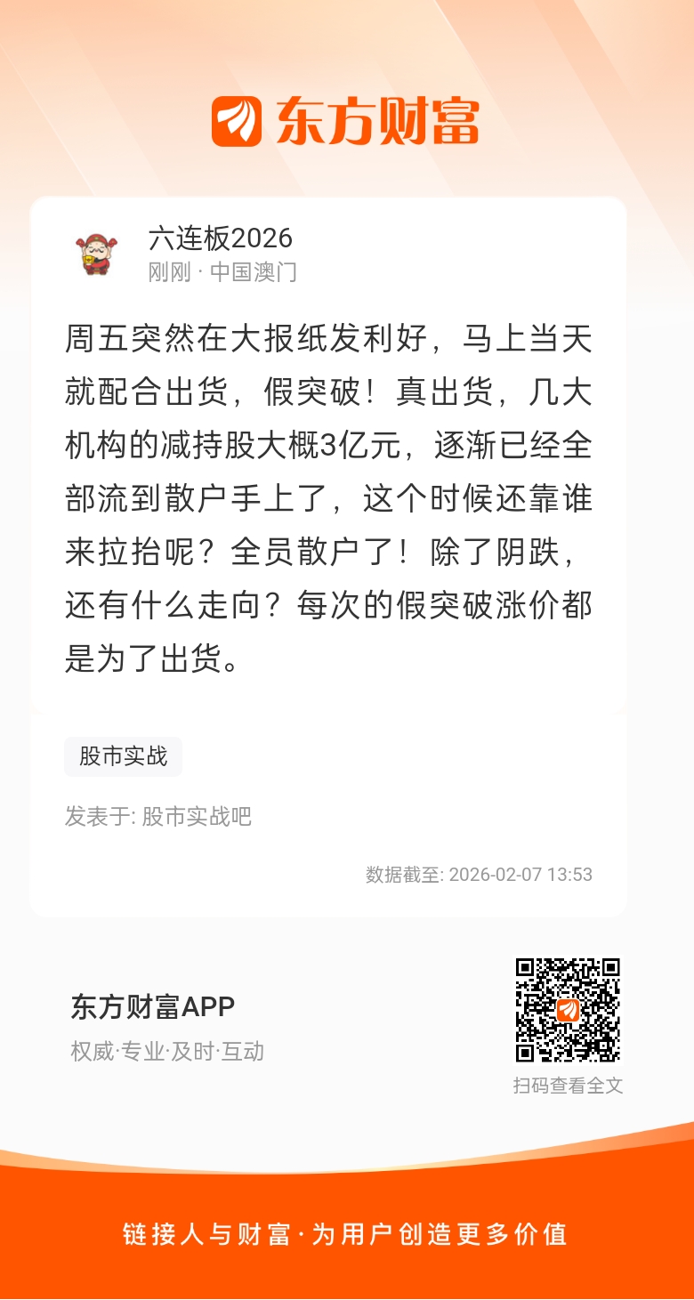 周五突然在大报纸发利好,马上当天就配合出货,假突破!真出货,几大机构的减持股大概3亿元,逐渐已经全部流到散户手上了,这个时候还靠谁来拉抬呢?全员散户了!除了阴跌,还有什么走向?每次的假突破涨价都是为了出货。