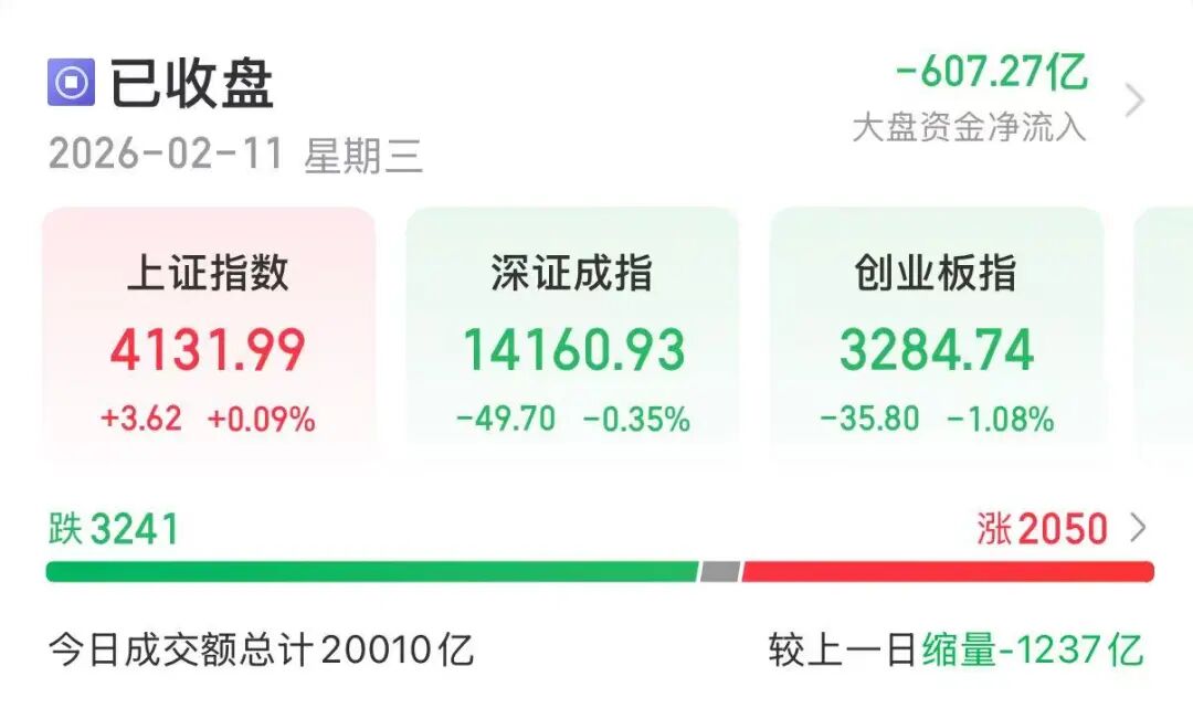 2月11日,A股市场震荡调整,热点板块全面切换。截至收盘,沪指涨0.09%,深证成指跌0.35%,创业板指跌1.08%。全市成交额20010亿元。