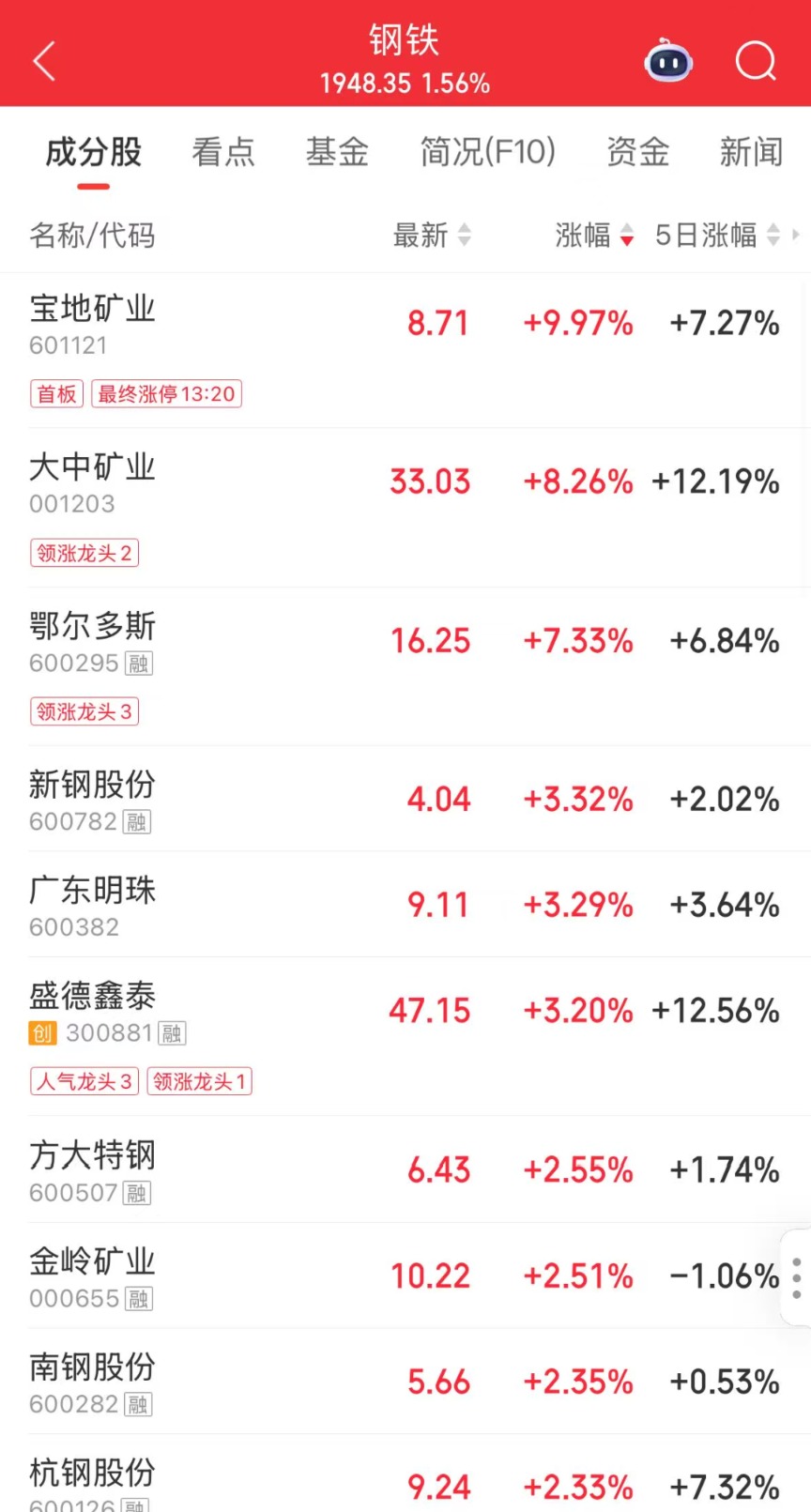 今日,钢铁板块持续走强。宝地矿业涨停,大中矿业、鄂尔多斯、新钢股份涨幅居前。