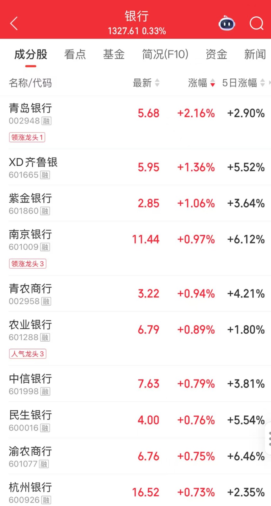 值得注意的是,午后,银行板块震荡上涨,青岛银行涨超2%,齐鲁银行、紫金银行、南京银行等跟涨。