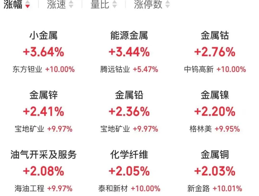 从今日盘面表现看,同花顺数据显示,多个金属相关概念,如小金属、能源金属、金属钴、金属镍等“霸榜”涨幅榜。中钨高新、章源钨业等多股涨停。