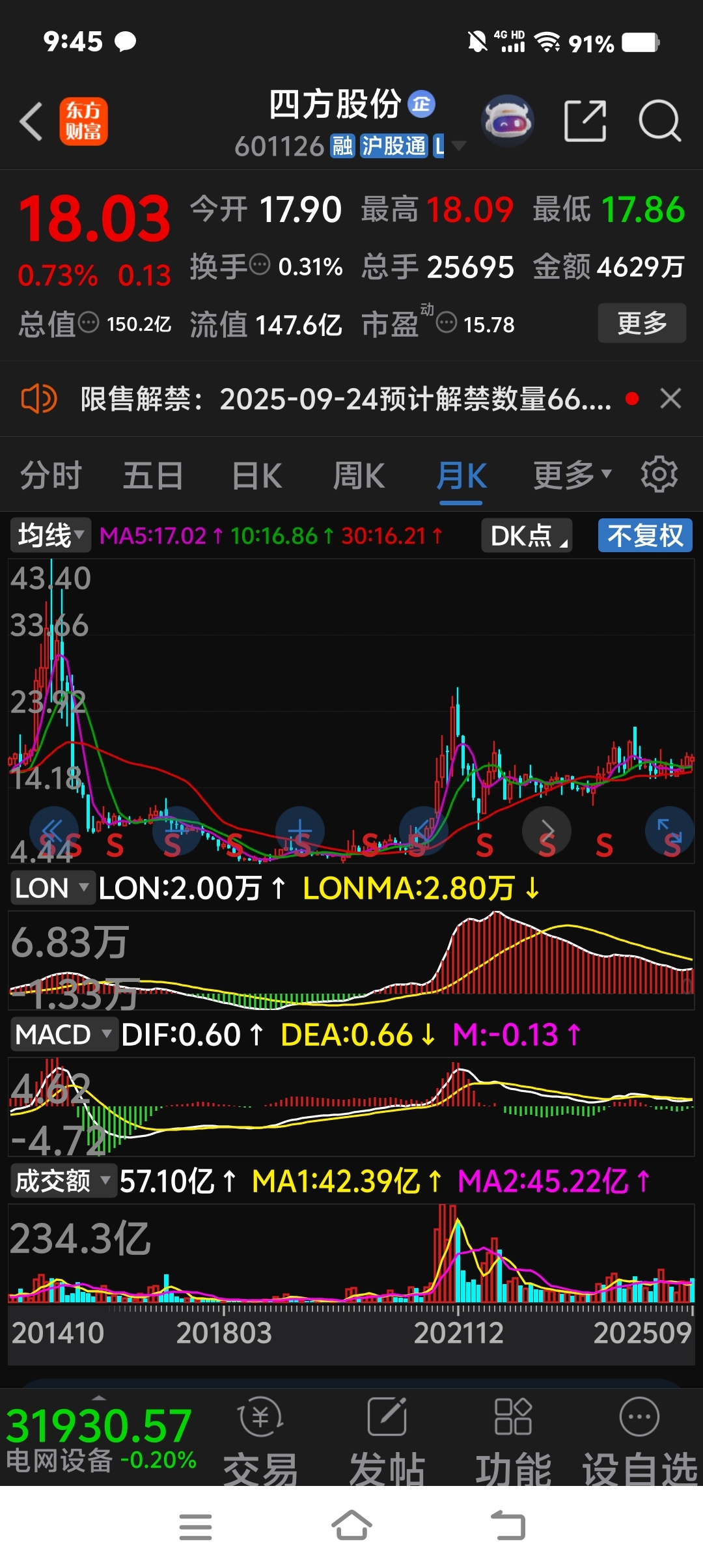 $四方股份(SH601126)$ 不论是周线月线横盘已久,准备开始启程目标36左右!