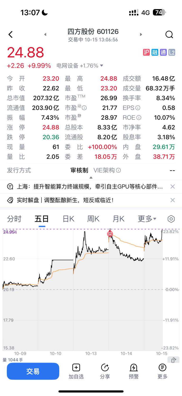 $四方股份(SH601126)$ 昨天把我挂山顶