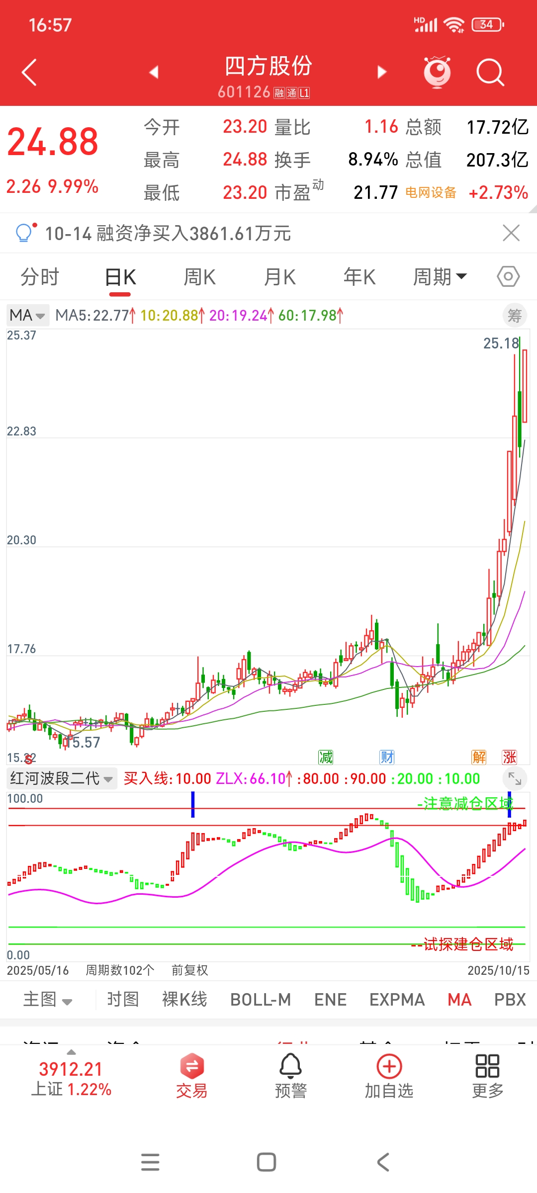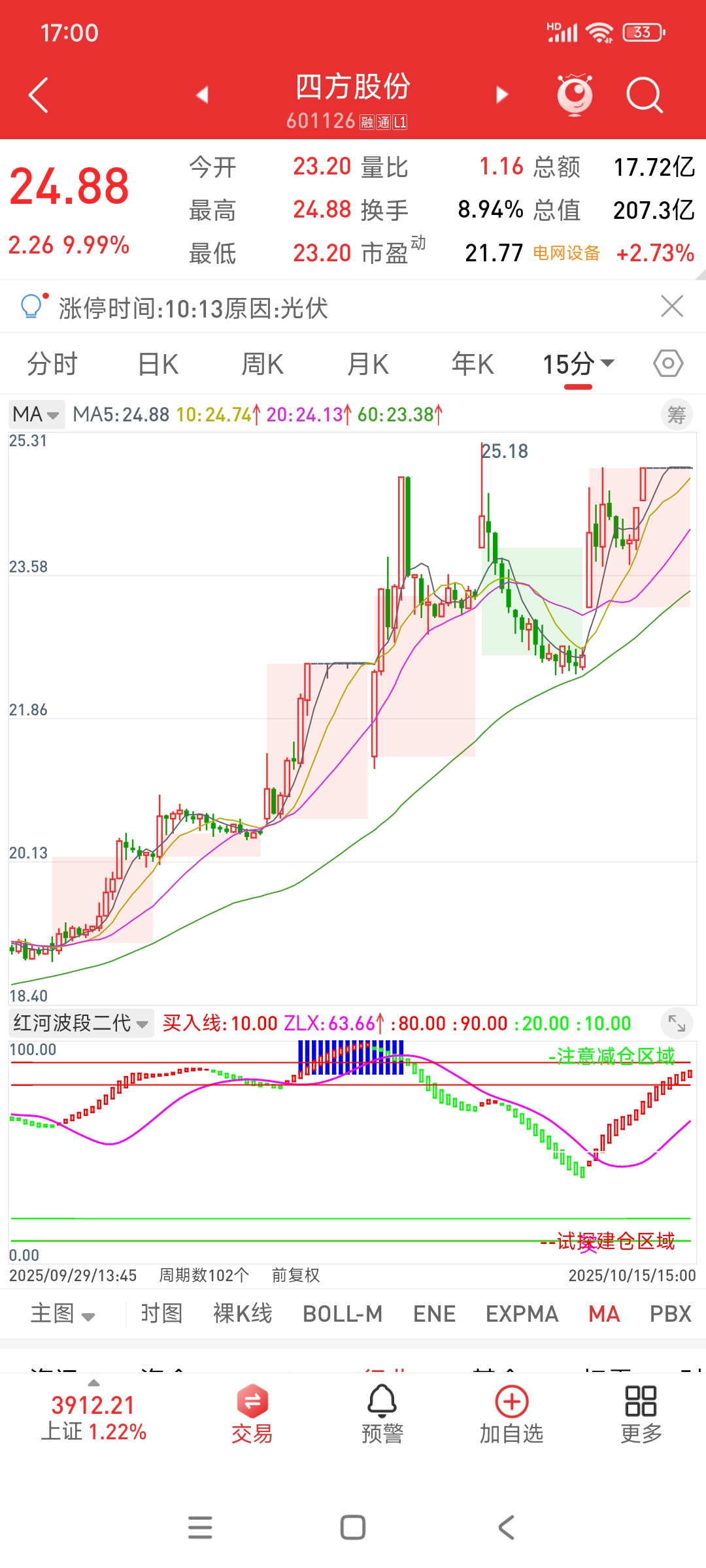 $四方股份(SH601126)$ 昨天的大跌有谁被吓出来了?但实际上日线级别红柱并没有转绿柱,而昨天的回调也就是15分钟级别的回调而已,15分钟底部出现买字以后绿柱转红柱做确认,一路上行,那就没什么可说的了,红柱不停,上涨不止,红柱拉长,加速不止,继续冲