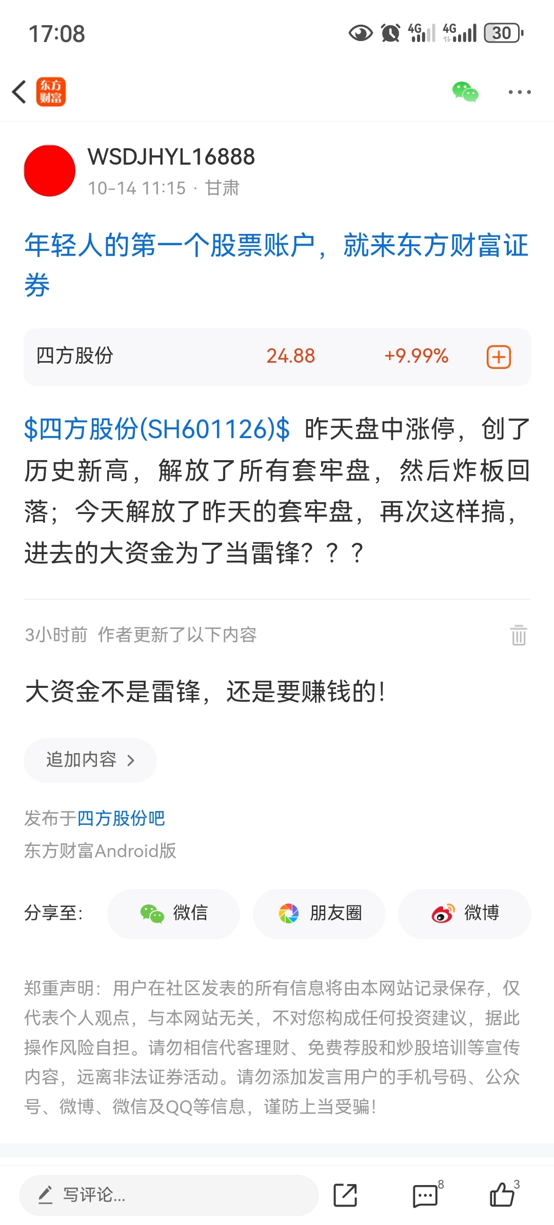 温馨提示: 1.根据《证券法》规定,禁止编造、传播虚假信息或者误导性信息,扰乱证券市场;2.用户在本社区发表的所有资料、言论等仅代表个人观点,与本网站立场无关,不对您构成任何投资建议。用户应基于自己的独立判断,自行决定证券投资并承担相应风险。《东方财富社区管理规定》