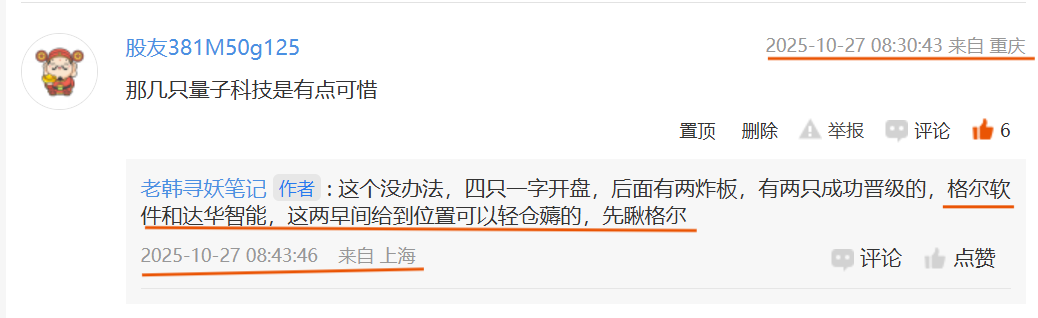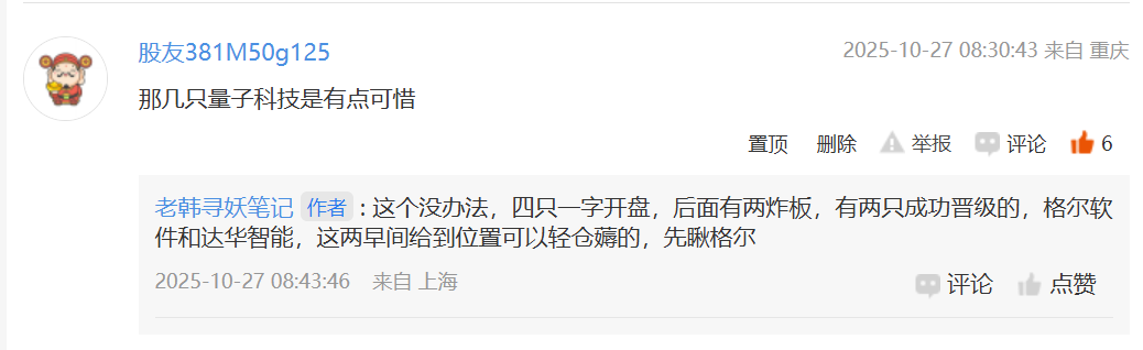 现在走势紧贴量子科技,今天的市场情绪只要大盘不搞事情,板块问题不大,第一种情况大概率去平开会去下探洗一波人出去,毕竟龙虎榜买方4个量化加一个独孤一剑,早盘肯定会磨,不跌破19.00就没事,千万不要被洗出去,这么大题材格尔才两连板就断了,昨天虽然炸板但也是大阳线,今天很有可能直接反包涨停,早上市场情绪高昂就静待花开。第二种情况,直接去震荡补缺口,在这个位置横住,那短线基本没戏,macd掉头+kdj超买。无论哪种情况,老韩都会在评论区陪着大家,小关点上,跟上老韩的薅点,也要看好跑路点,毕竟短线就是频繁快速操作,错过了可就是错过了。