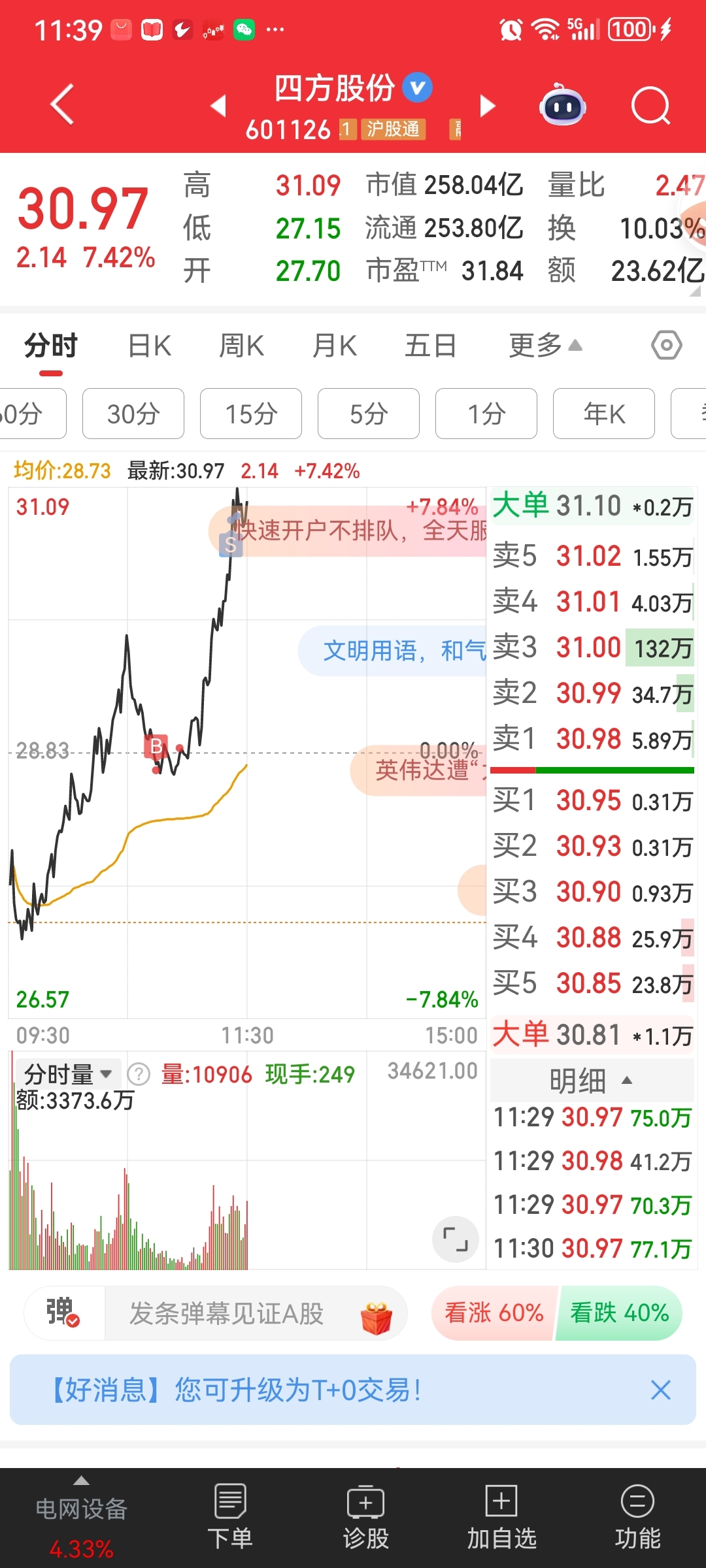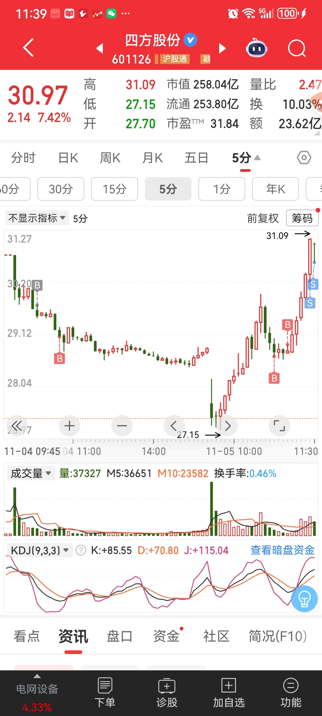 $四方股份(SH601126)$ 低开后,冲高到39.15之上,警报解除,回到平盘附近,承接还行,卖盘枯竭,板块强劲,开仓信号明显,就买入做了个T!有主升迹象,持有等待,今天之后的首板是主升开始的信号,也是超短资金的博弈点,持有底仓并耐心等待,短线别轻易加仓,防止心态崩溃