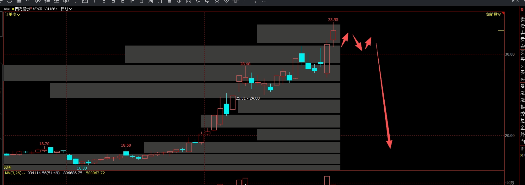 通过横盘做一下诱多,然后触发斩首效果四方股份直接一口气九十度直角暴跌到18元