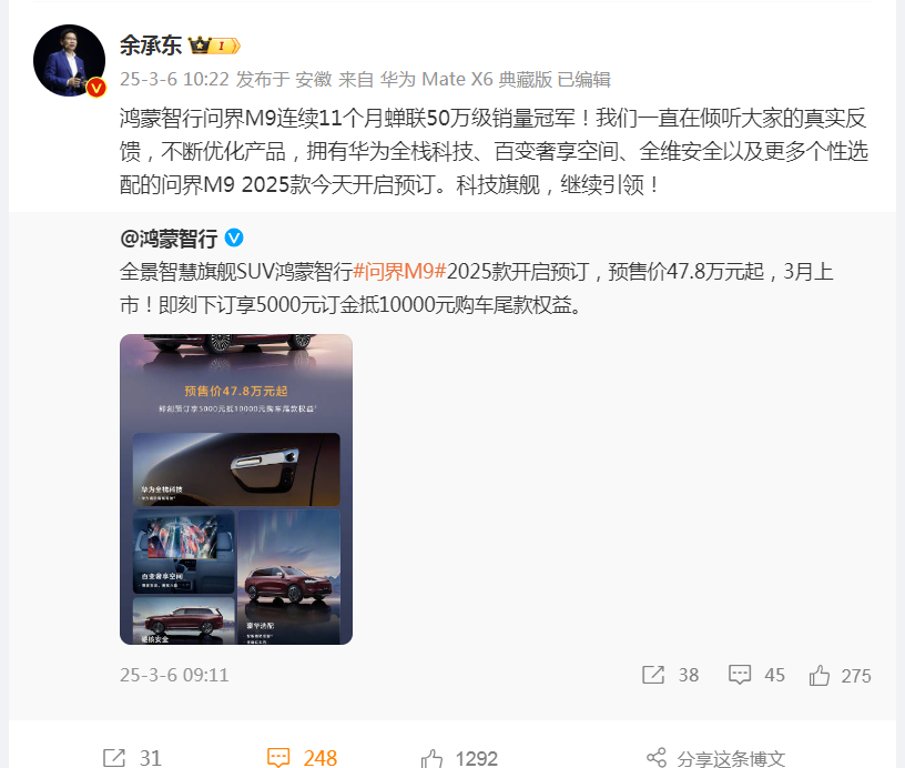 余承东3月6日在微博发文称,鸿蒙智行问界M9连续11个月蝉联50万级销量冠军!我们一直在倾听大家的真实反馈,不断优化产品,拥有华为全栈科技、百变奢享空间、全维安全以及更多个性选配的问界M9 2025款今天开启预订。